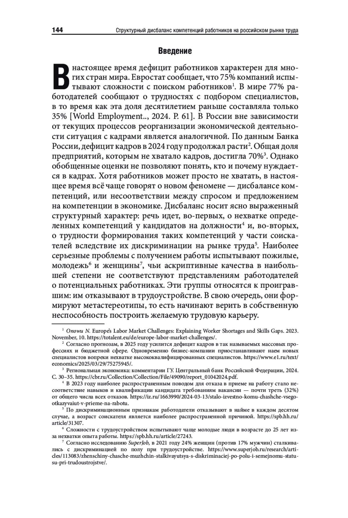 В статье рассматриваются вопросы дефицита кадров и вовлечения в трудовую деятельность менее конкурентных на рынке труда групп. В теоретической части указывается, что нехватка кадров по крайней мере частично может быть связана с кризисом компетентности соискателей, который в настоящее время приобретает социально-структурный характер. Проблемы возникают у лиц пожилого возраста, молодежи и женщин, чьи знания, умения и навыки в наибольшей степени отличаются от потребностей рынка труда. В статье приводятся результаты эмпирического анализа компетенций соискателей на основе их групповой принадлежности. Оценка базируется на привлечении в исследование новых источников информации и использовании новых методов их обработки. Представлены авторские концепция, техническая методология и результаты изучения текстовых данных вакансий и резюме, собранных с онлайн-площадок по поиску работы Headhunter, Zarplata. ru, «Работа в России», за период с 2019 по 2023 год. На базе полученной коллекции документов, содержащих требования к соискателям и навыки/знания, записанные в резюме, разработана комплексная (многослойная) таксономия компетенций и определены их укрупненные группы. На основании определения стоимости отдельных компетенций выделены и охарактеризованы элитные, умеренные и экономные компетенции. Выявлено, что на российском рынке труда больше распространены недорогие компетенции. Половозрастные различия соискателей в овладении компетенциями приводят к эффекту смещения вниз по шкале неравенства для молодежи, женщин и пожилых лиц. Побочным (незапланированным) итогом стало обнаружение нескольких значимых эффектов, сопровождающих повышение компетентности работников. В настоящее время к наиболее значимым относятся следующие: накопление компетенций в течение трудовой жизни, устаревание отдельных компетенций, обновление компетенций (или валоризация долгое время маловостребованных компетенций), сложность и простота в овладении отдельными компетенциями (что разделяет группы работников), благоприятные возможности для соискателей в повышении квалификации.