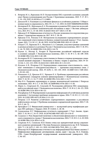 1. Агафонов В. Б. ESG-принципы и гринвошинг: правовые проблемы дифференциации // Актуальные проблемы российского права. 2024. Т. 19. № 9(166). С. 132-141. https://doi.org/10.17803/1994-1471.2024.166.9.132-141.