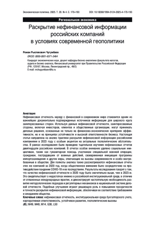 Нефинансовая отчетность наряду с финансовой в современном мире становится одним из важнейших документально подтвержденных источников информации для широкого круга заинтересованных сторон. Используя данные нефинансовой отчетности, заинтересованные стороны, включая инвесторов, клиентов и общественные организации, могут принимать деловые решения, основанные не только на финансово-экономических критериях эффективности, но и на принципах устойчивости и высокой ответственности бизнеса. Настоящая статья направлена на анализ практики раскрытия нефинансовой информации российскими компаниями в 2023 году с особым акцентом на актуальные геополитические обстоятельства. В рамках исследования было проведено тщательное изучение нефинансовых отчетов девятнадцати российских компаний. В отчетах особое внимание уделено социальным инициативам, таким как гуманитарная помощь участникам специальной военной операции, гражданам, пострадавшим от военных действий, своевременная инициация программы импортозамещения и другие меры, отвечающие на вызовы современности и особо востребованные в обществе. Для полноты анализа также рассматриваются нефинансовые отчеты этих же компаний за 2020 год, когда общественное внимание было сосредоточено на противодействии пандемии COVID-19 и ее последствиям. Результаты исследования говорят о том, что качество нефинансовой отчетности в 2020 году было значительно выше, чем в 2023-м. Это свидетельствует о недостатках именно в российской институциональной среде, в отличие от отлаженных международных практик, и демонстрирует настоятельную необходимость развития методологических подходов и регуляторных механизмов в национальной системе деловой отчетности. Подобные улучшения играют решающую роль в повышении прозрачности и точности раскрытия нефинансовой информации, обеспечивая ее соответствие требованиям и ожиданиям общества.