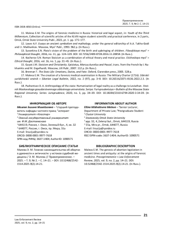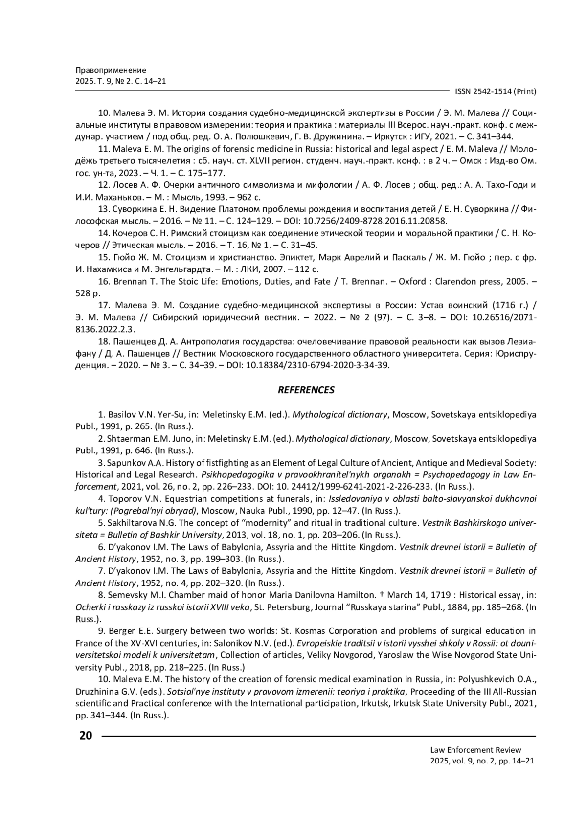17. 	Малева Э. М. Создание кобно-медицинской экспертизы в России: Устав воинский (1716 г.) / Э. М. Малева // Сибирский юридический вестник. - 2022. - № 2 (97). - С. 3-8. -. DOI: 10.26516/2071-8136.2022.2.3 EDN: LPSOHN