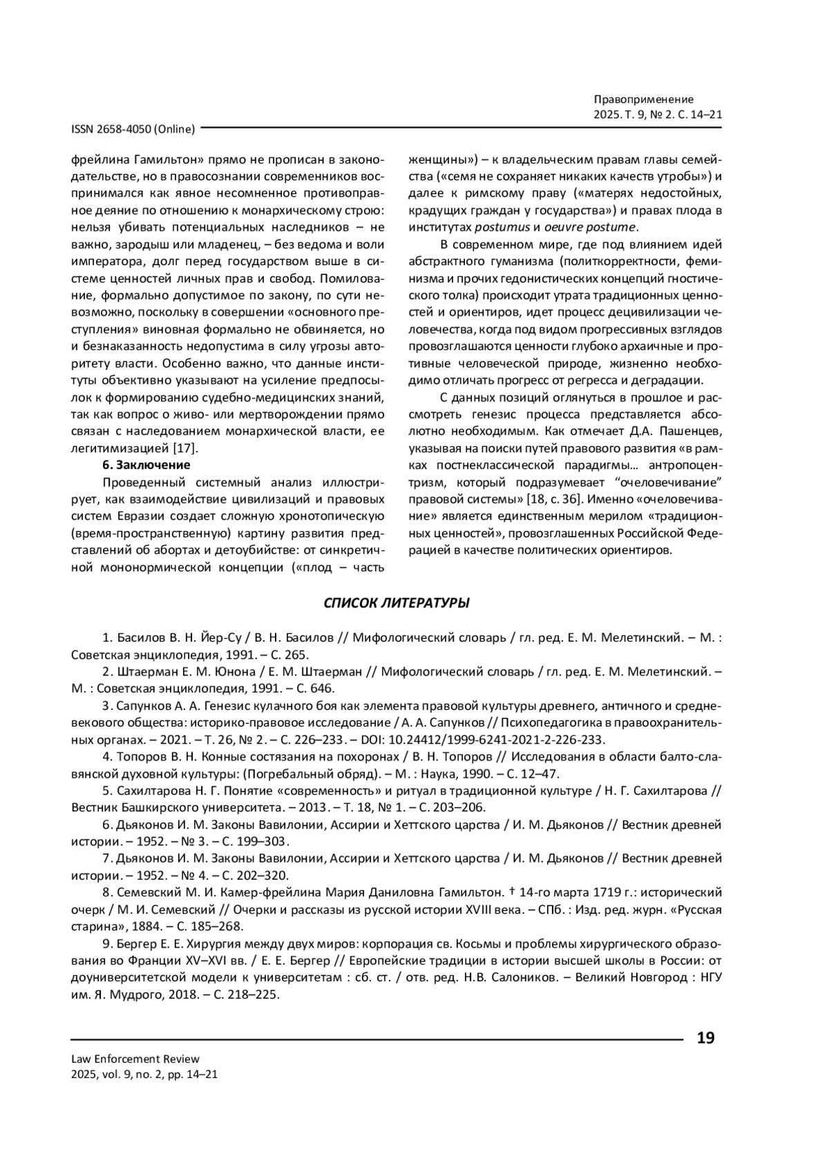 Исследуются развитие законодательства об абортах в соотношении с эволюцией представленного человека о мироустройстве, усложнении структуры общества и изменении системы наследования в обществе. Представлено, как эти факторы влияют на развитие предпосылок формирования бобно-медицинских знаний, так как вопрос о живо- или мертворождении прямо связан с наследованием монархической власти, ее легитимизацией. Статья иллюстрирована примерами, которые подкрепляются ссылками на законодательство соответствующего периода. Автор обосновывает углубленное исследование генезиса законодательства об абортах с Датой представления полной исторической картины, в рамках которой начинается формироваться судебная медицина и закрепляться на законодательном уровне.