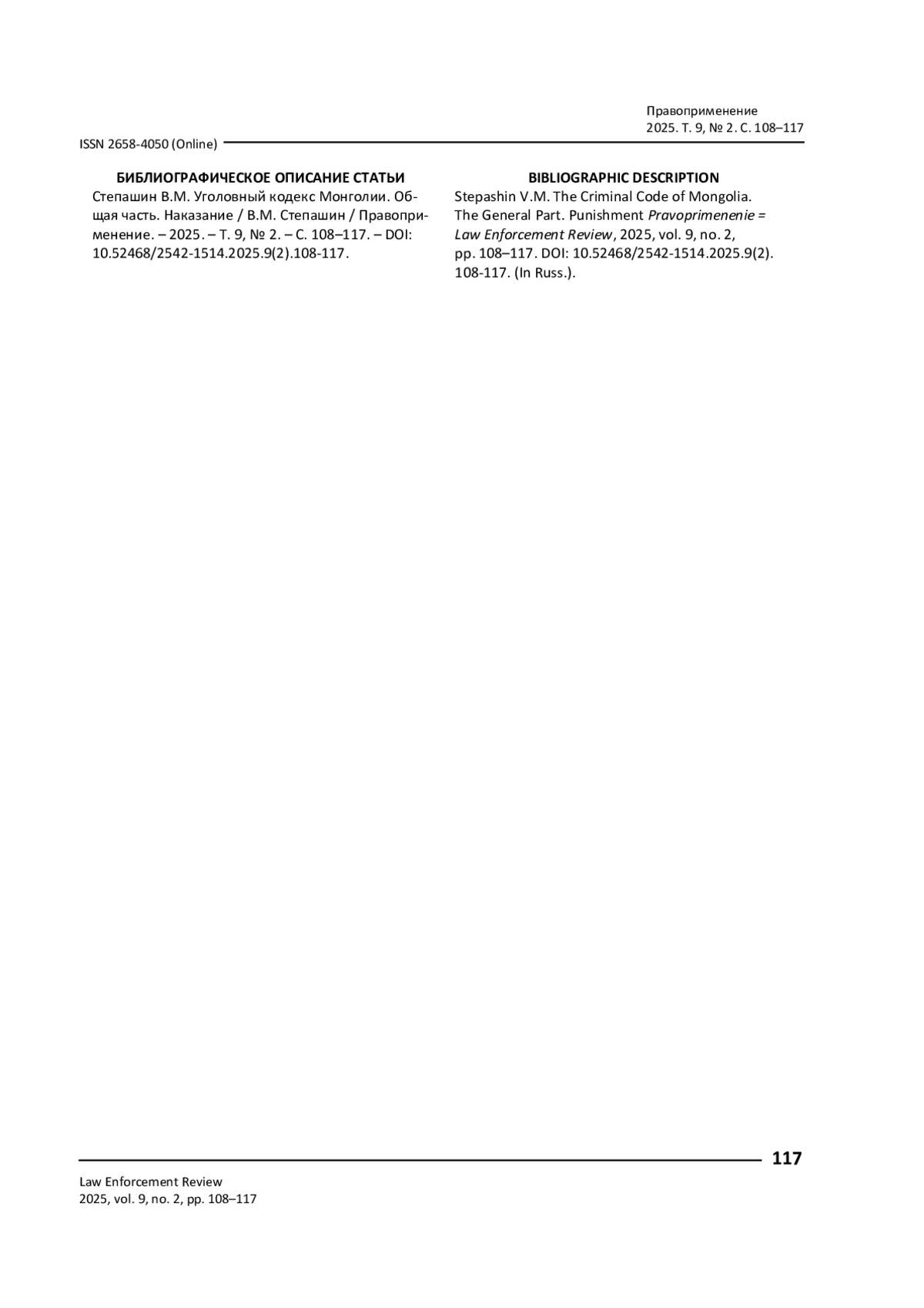 1. Степашин В. М. Уголовный Кодекс Монголии. Общая часть. Преступление / В. М. Степашин // Правоприменение. - 2024. - Т. 8, № 3. - С. 142-151. - https://doi.org/10.52468/2542-1514.2024.8(3).142-151.