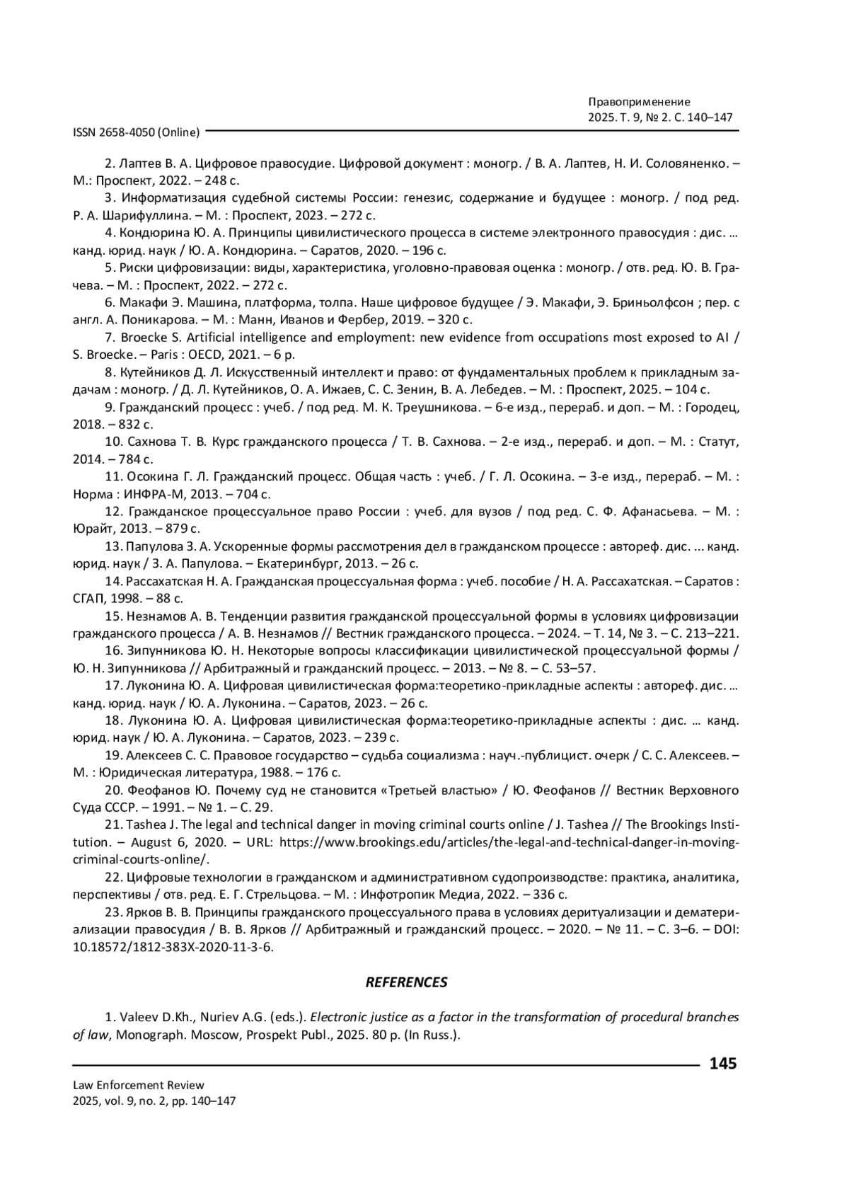 1. Электронное правосудие как фактор трансформации процессуальных отраслей права : моногр. / под ред. Д. Х. Валеева, А. Г. Нуриева. - М. : Проспект, 2025. - 80 с.