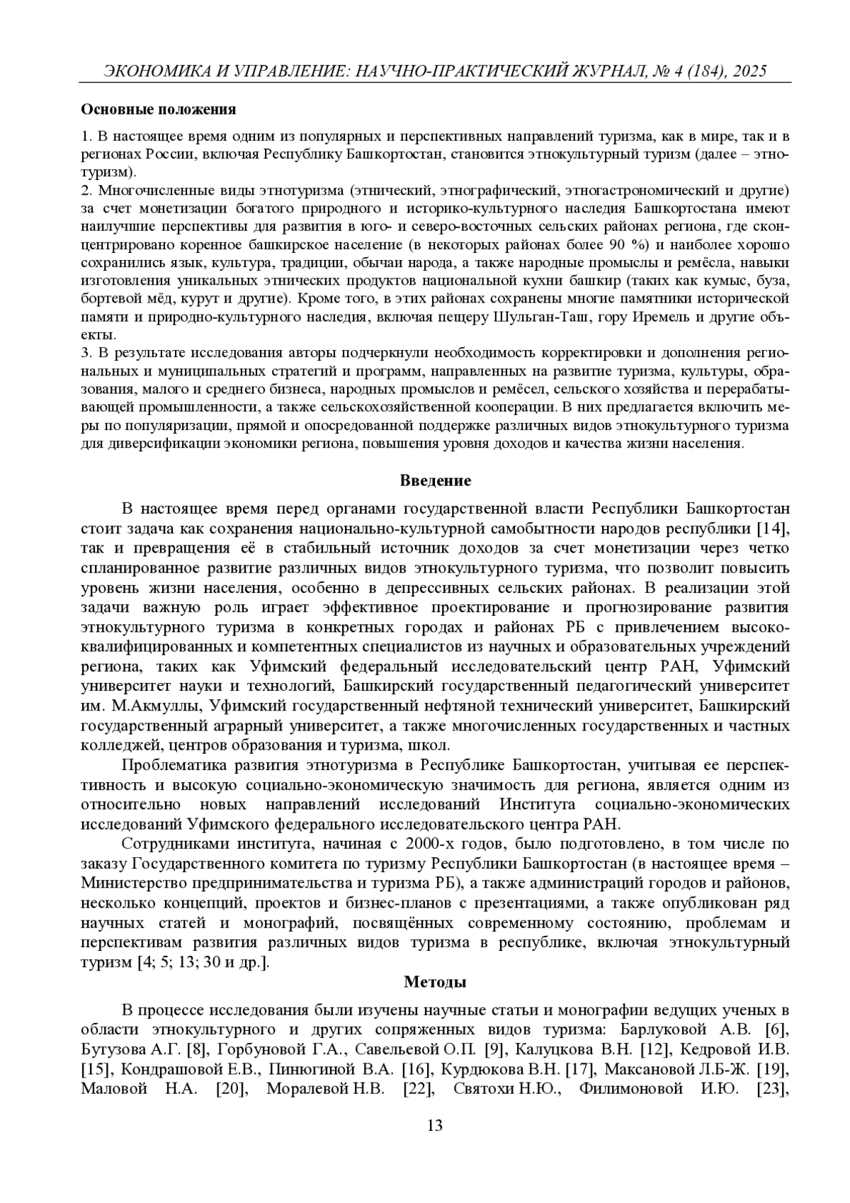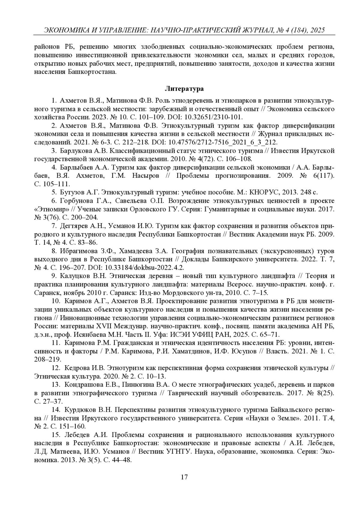 10. Каримов А.Г., Ахметов В.Я. Проектирование развития этнотуризма в РБ для монетизации уникальных объектов культурного наследия и повышения качества жизни населения региона // Инновационные технологии управления социально-экономическим развитием регионов России: материалы XVII Междунар. научно-практич. конф., посвящ. памяти академика АН РБ, д.э.н., проф. Исянбаева М.Н. Часть II. Уфа: ИСЭИ УФИЦ РАН, 2025. С. 65-71. EDN: TWVCSY