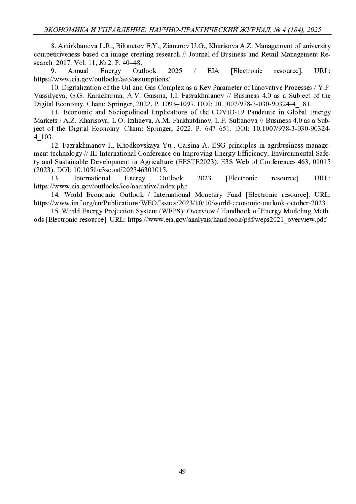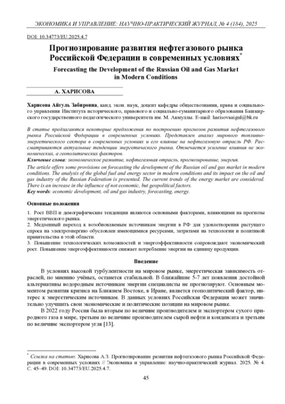 ХАРИСОВА А. З. ПРОГНОЗИРОВАНИЕ РАЗВИТИЯ НЕФТЕГАЗОВОГО РЫНКА РОССИЙСКОЙ ФЕДЕРАЦИИ В СОВРЕМЕННЫХ УСЛОВИЯХ // ЭКОНОМИКА И УПРАВЛЕНИЕ: НАУЧНО-ПРАКТИЧЕСКИЙ ЖУРНАЛ. 2025. № 4 (184)