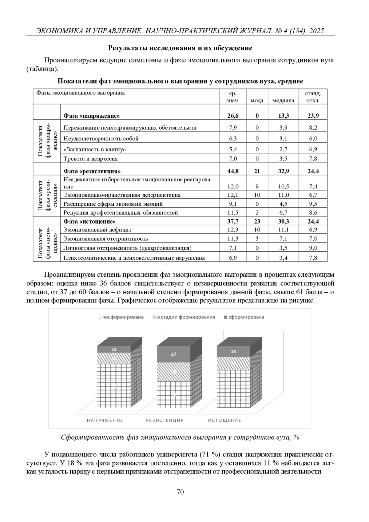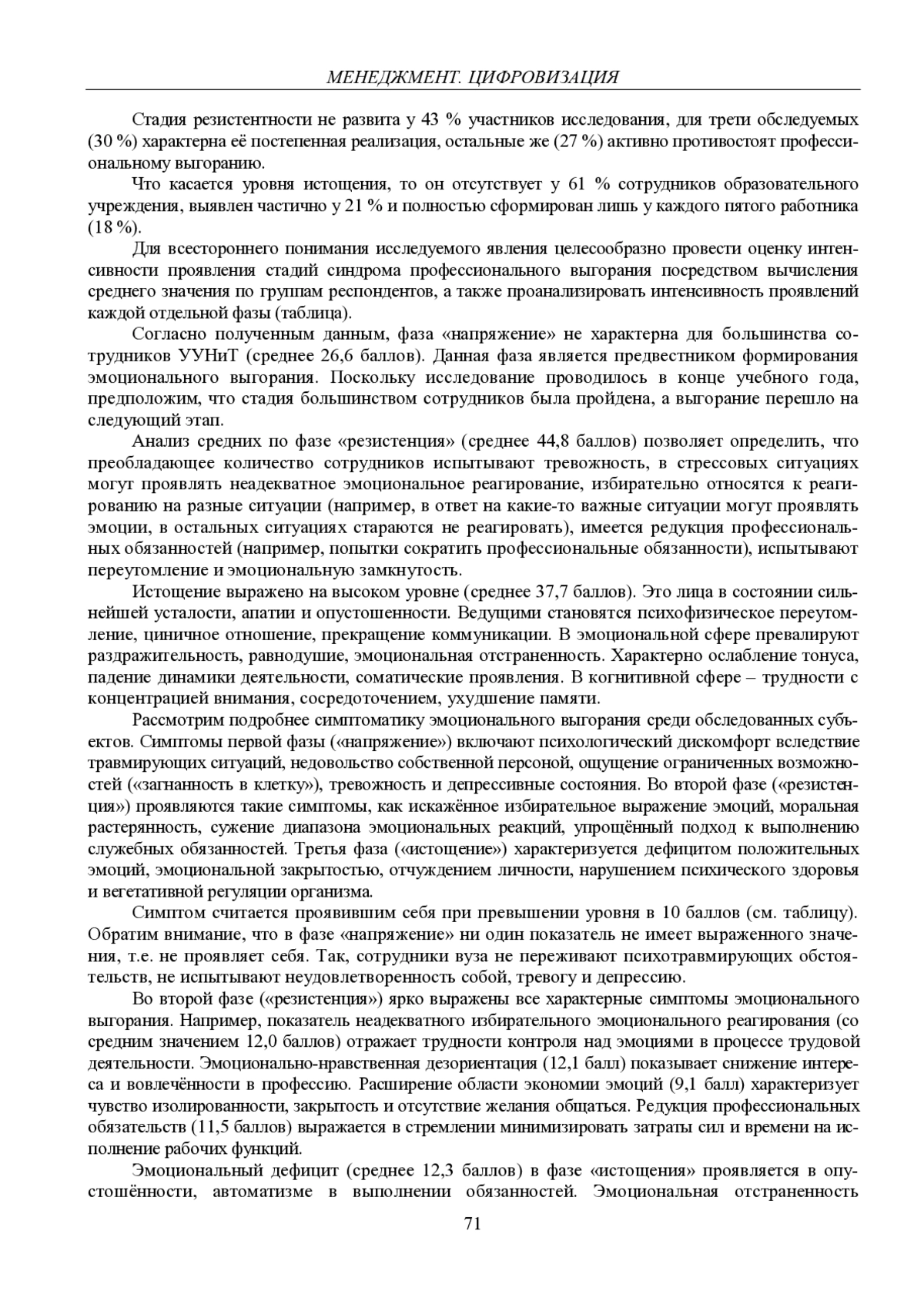 В статье рассматривается проблема эмоционального выгорания. Целью исследования стало описание выраженности фаз эмоционального выгорания у сотрудников вуза (на примере Уфимского университета науки и технологий (УУНиТ)). В исследовании приняли участие 374 сотрудника (административно-управленческий и профессорско-преподавательский состав). В ходе исследования было выявлено, что большинство сотрудников находятся в фазе «резистенция», т. е. защищаются от давления извне, стараются оградить себя от негативных переживаний, при этом вырабатывают привычку сопротивляться постоянным стрессам, испытывая недовольство собой и своей профессиональной деятельностью; имеются попытки сократить обязанности.