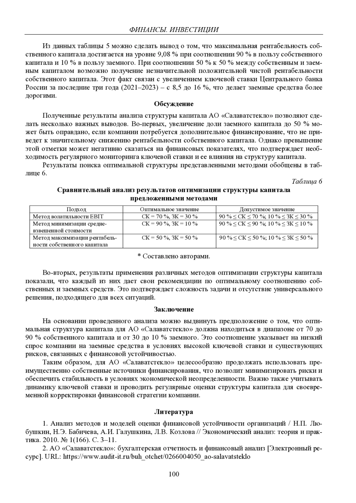 Проведенное исследование указывает, что успешному развитию АО «Салаватстекло», одного из крупнейших предприятий в Башкортостане, способствует правильная оценка структуры источников финансирования деятельности. Целью исследования является оценка применения методов оптимальной структуры капитала компании. Проведенные расчеты указывают на то, что оптимальная структура источников финансирования АО «Салаватстекло» с применением предлагаемых методов представляет собой различное соотношение собственного и заемного капитала