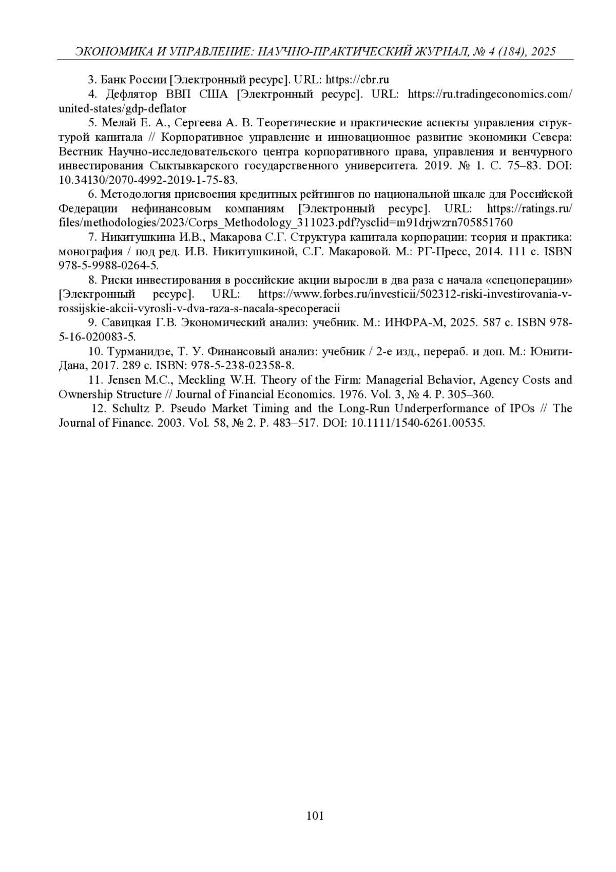 5. Мелай Е. А., Сергеева А. В. Теоретические и практические аспекты управления структурой капитала // Корпоративное управление и инновационное развитие экономики Севера: Вестник Научно-исследовательского центра корпоративного права, управления и венчурного инвестирования Сыктывкарского государственного университета. 2019. № 1. С. 75-83. DOI: 10.34130/2070-4992-2019-1-75-83 EDN: MEDJEY