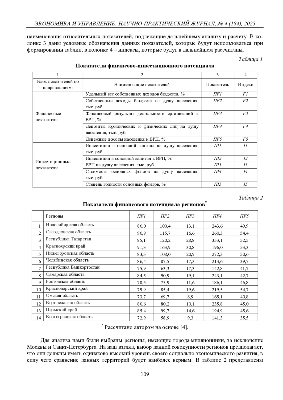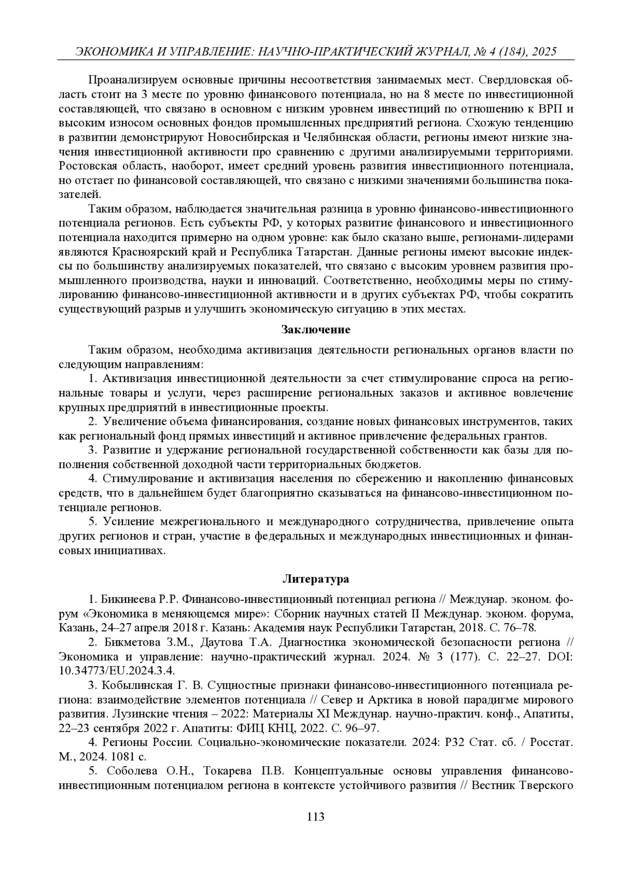 БИКМЕТОВА (. З. ОЦЕНКА ФИНАНСОВО-ИНВЕСТИЦИОННОГО ПОТЕНЦИАЛА РЕГИОНОВ // ЭКОНОМИКА И УПРАВЛЕНИЕ: НАУЧНО-ПРАКТИЧЕСКИЙ ЖУРНАЛ. 2025. № 4 (184)