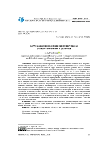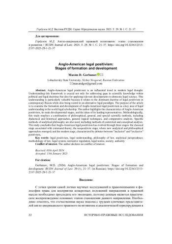 Англо-американский правовой позитивизм является влиятельным направлением в современной мировой правовой мысли. Его осмысление важно не только с точки зрения восполнения пробелов научного знания в сфере политико-правовых учений, но и с позиции имплементации наработок, релевантных для отечественной правовой науки. Особую ценность уяснение положений данного направления имеет еще и потому, что оно, с одной стороны, родственно для доминирующей в современной России доктрины правового позитивизма по кругу исследуемых вопросов, но, с другой стороны, сформировано в рамках альтернативной правовой парадигмы. Целью является исследование формирования и развития англо-американского правового позитивизма как одного из ключевых направлений правопонимания в мировой юридической науке. Автором показаны особенности англо-американского позитивизма, ключевые этапы развития и идеи ведущих представителей направления. Методологически исследование опирается на комплекс всеобщих, общенаучных, частнонаучных и специальных методов познания, включающих диалектический и исторический методы, общие логические приемы и метод сравнения. Также применяются специфические методы аналитической философии, включая методы контекстуального и концептуального анализа. В результате делается вывод, что англо-американский правовой позитивизм в своем становлении прошел три этапа: классический, связанный с командной теорией; неопозитивистский, в котором нашли свое применение новые аналитико-философские подходы; и современный, характеризующийся дискуссией между «включающим» и «исключающим» позитивизмом.