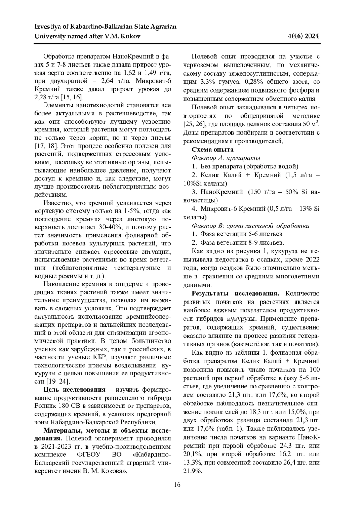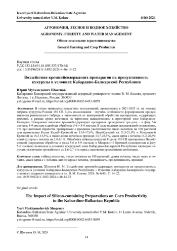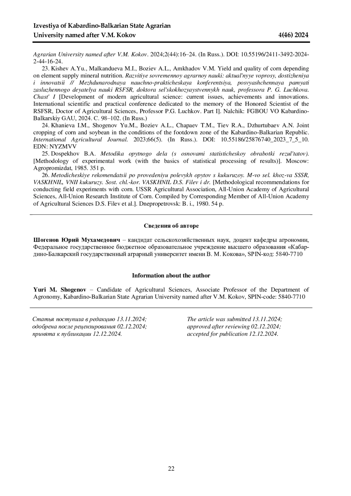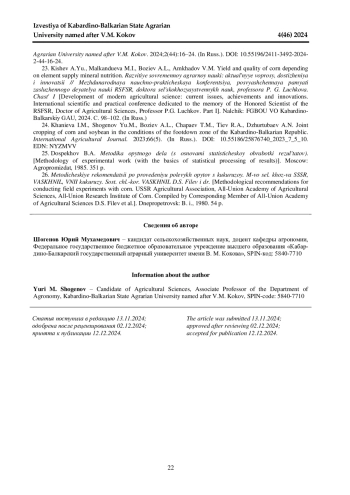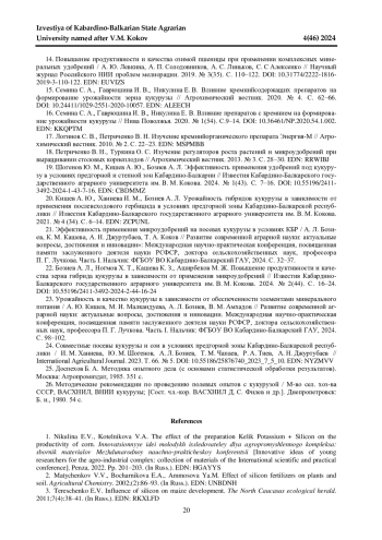 22. 	Бозиев А. Л., Ногмов Х. Т., Кашева К. З., Аширбеков М. Ж. Повышение продуктивности и качества зерна гибрида кукурузы в зависимости от применения микроудобрений // Известия Кабардино-Балкарского государственного аграрного университета им. В. М. Кокова. 2024. № 2(44). С. 16-24. DOI: 10.55196/2411-3492-2024-2-44-16-24 EDN: MSBSMK