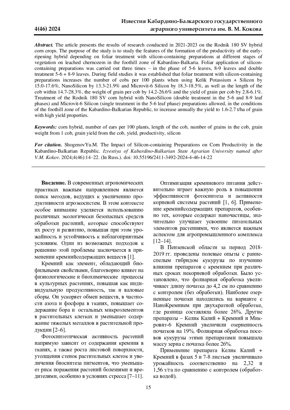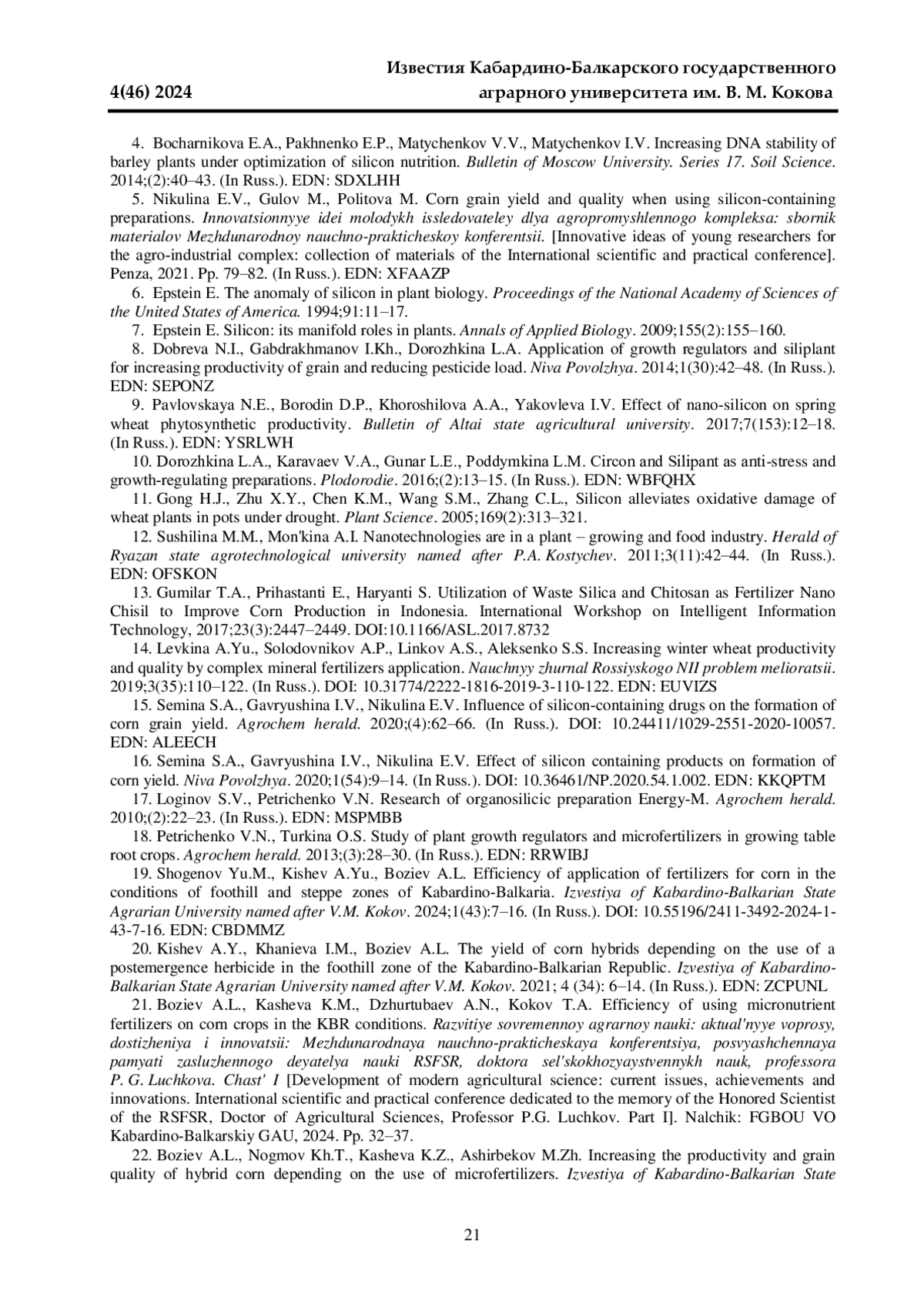 16. 	Семина С. А., Гаврюшина И. В., Никулина Е. В. Влияние препаратов с кремнием на формирование урожайности кукурузы // Нива Поволжья. 2020. № 1(54). С.9-14. DOI: 10.36461/NP.2020.54.1.002 EDN: KKQPTM