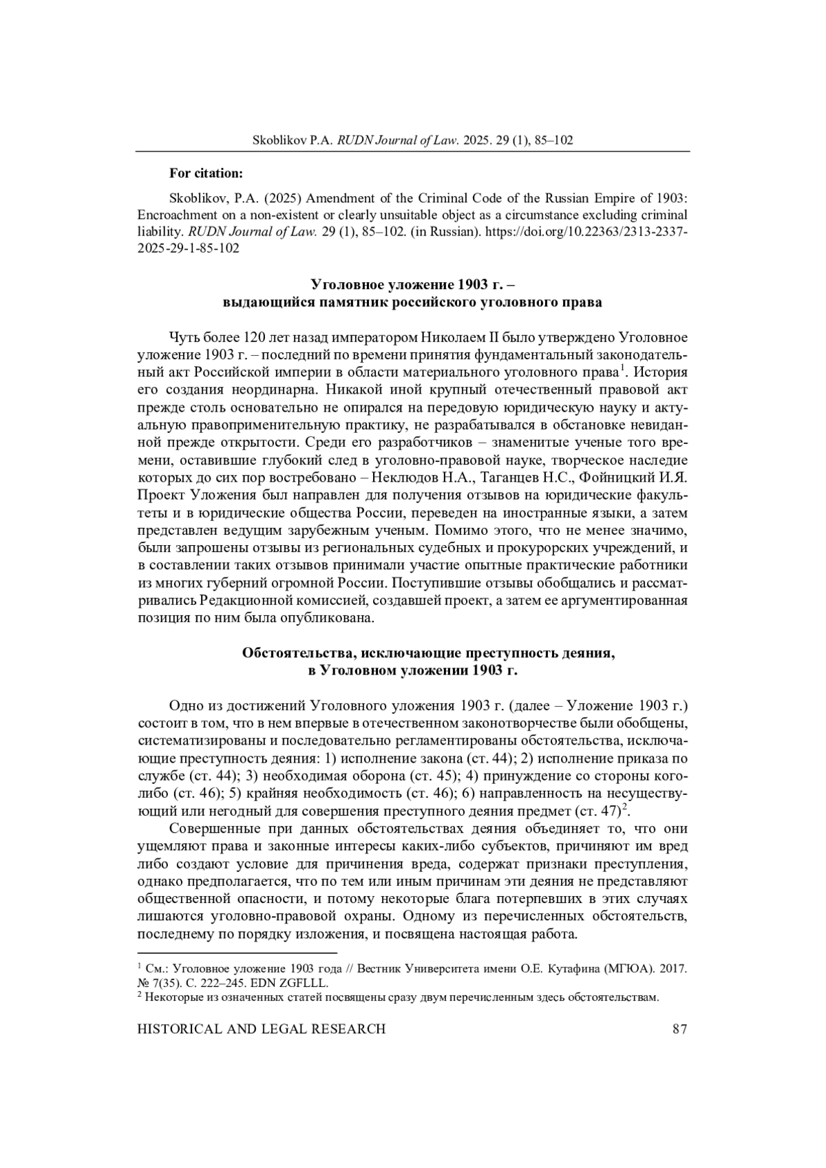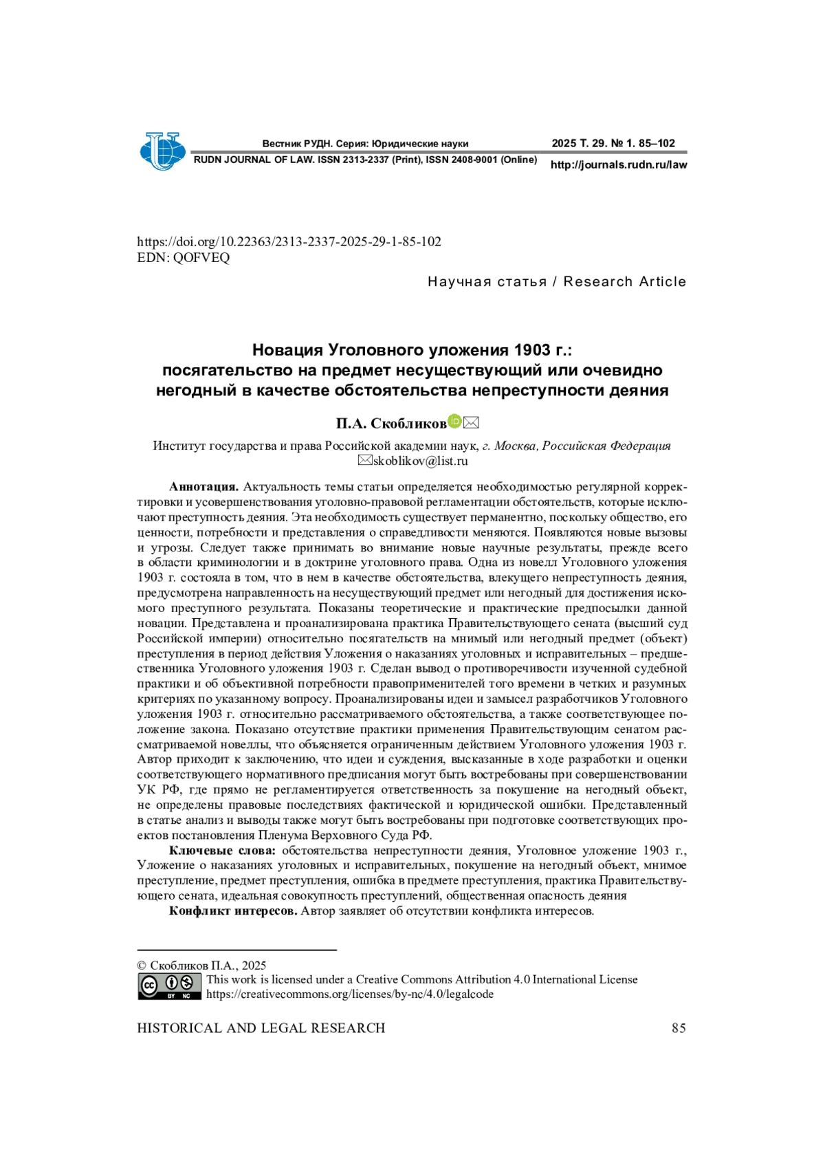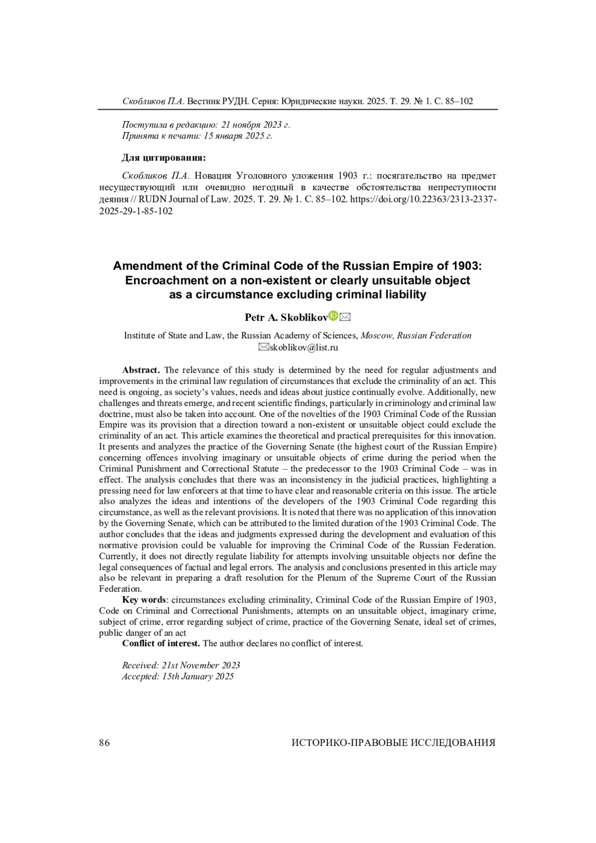 СКОБЛИКОВ П. А. НОВАЦИЯ УГОЛОВНОГО УЛОЖЕНИЯ 1903 Г.: ПОСЯГАТЕЛЬСТВО НА ПРЕДМЕТ НЕСУЩЕСТВУЮЩИЙ ИЛИ ОЧЕВИДНО НЕГОДНЫЙ В КАЧЕСТВЕ ОБСТОЯТЕЛЬСТВА НЕПРЕСТУПНОСТИ ДЕЯНИЯ // ВЕСТНИК РОССИЙСКОГО УНИВЕРСИТЕТА ДРУЖБЫ НАРОДОВ. СЕРИЯ: ЮРИДИЧЕСКИЕ НАУКИ. 2025. Т. 29 № 1