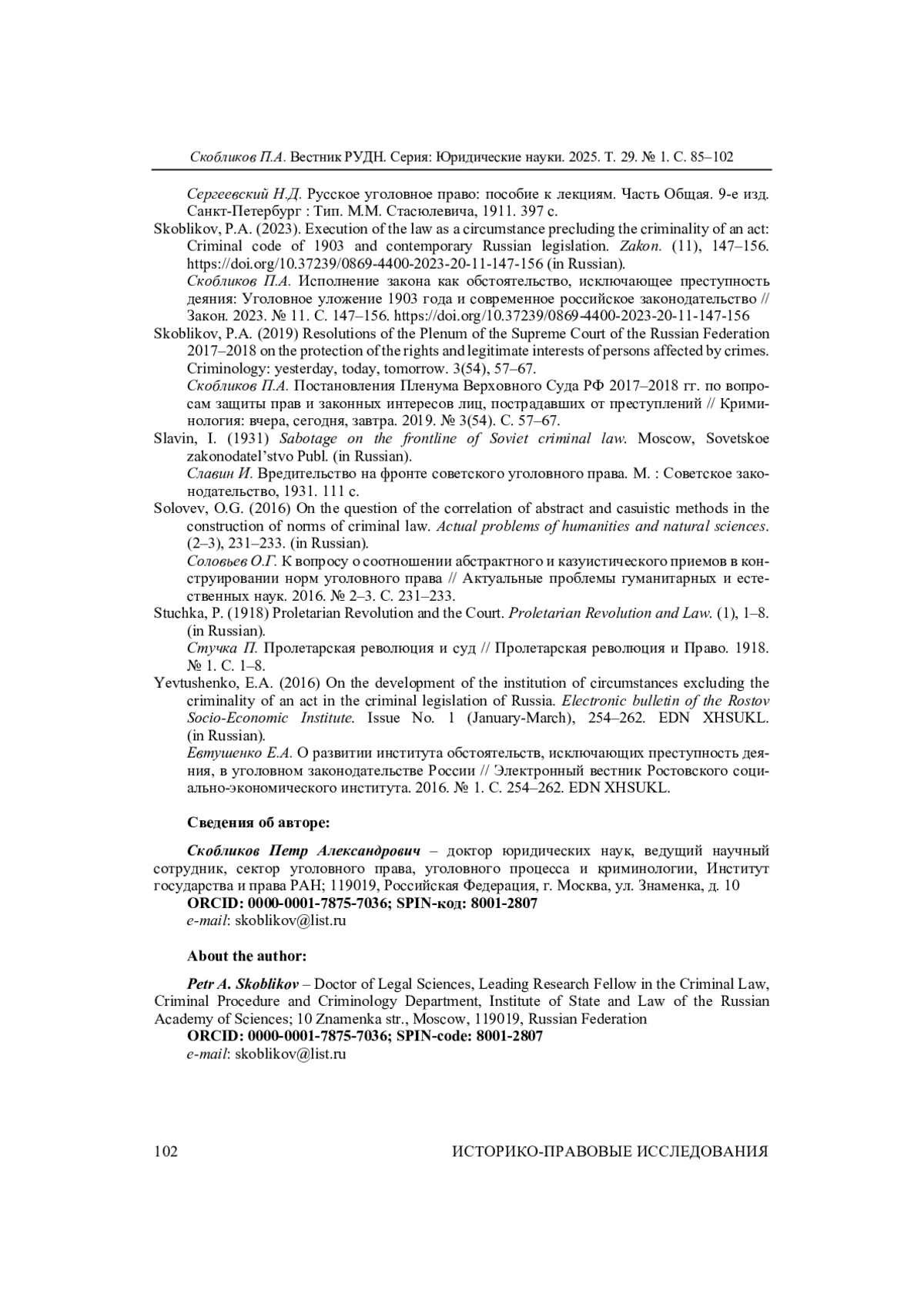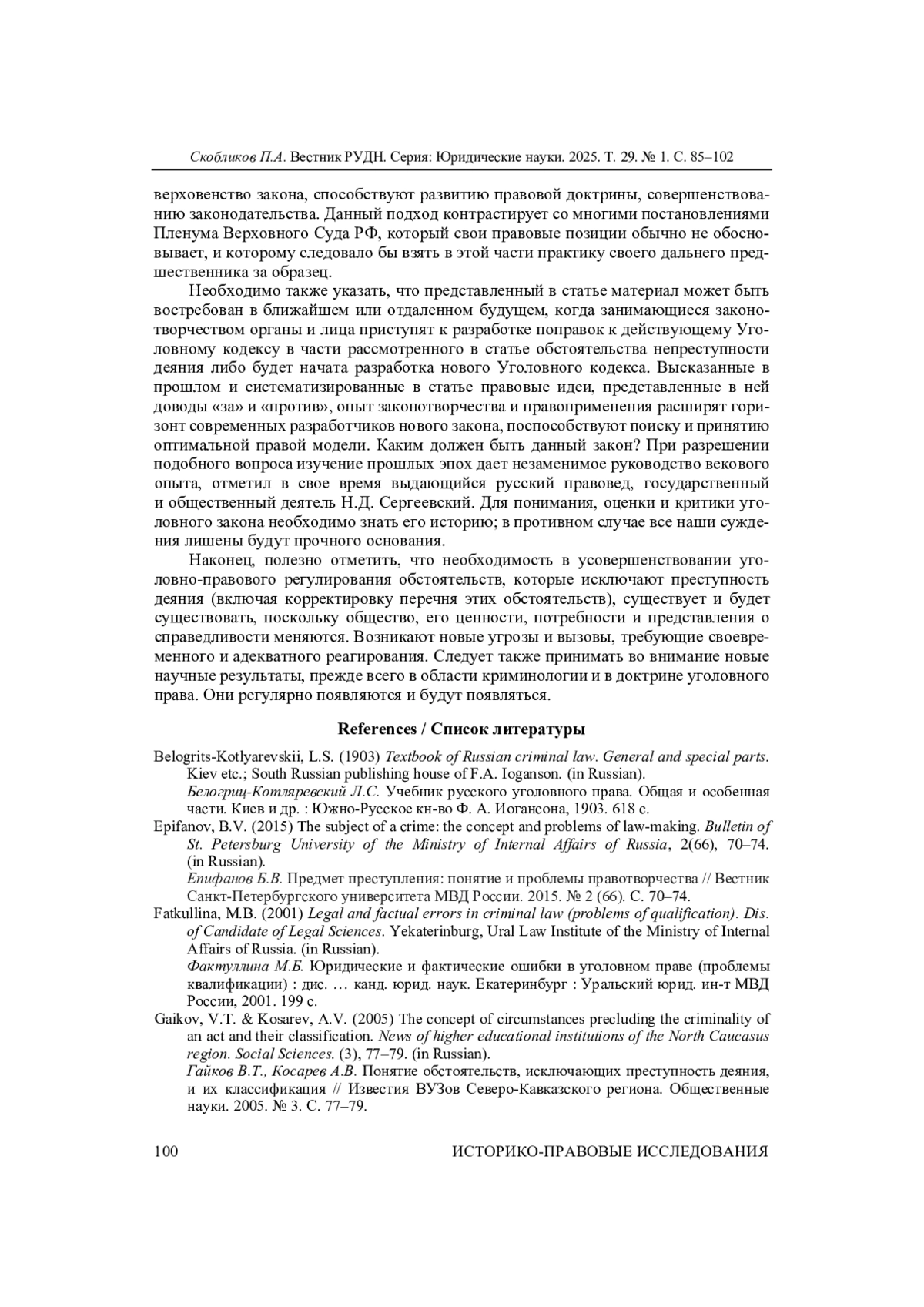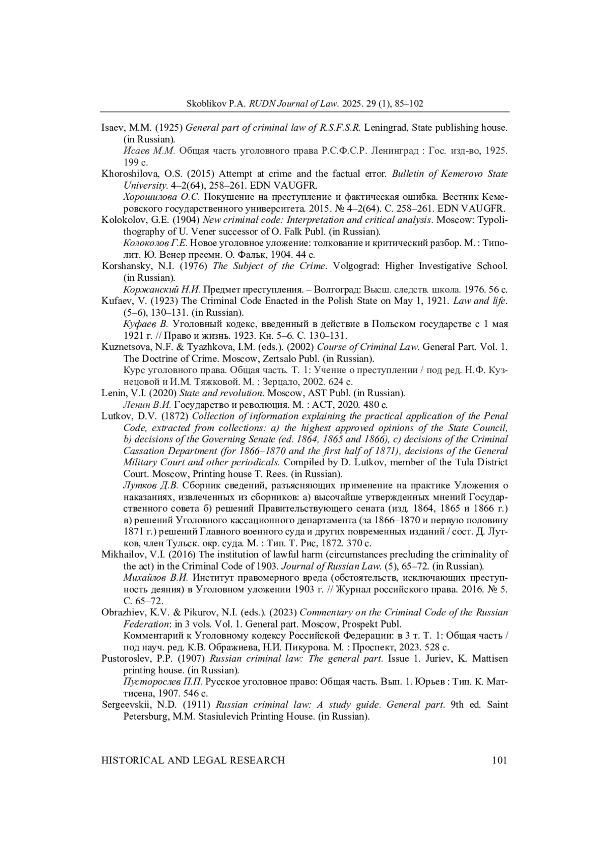 СКОБЛИКОВ П. А. НОВАЦИЯ УГОЛОВНОГО УЛОЖЕНИЯ 1903 Г.: ПОСЯГАТЕЛЬСТВО НА ПРЕДМЕТ НЕСУЩЕСТВУЮЩИЙ ИЛИ ОЧЕВИДНО НЕГОДНЫЙ В КАЧЕСТВЕ ОБСТОЯТЕЛЬСТВА НЕПРЕСТУПНОСТИ ДЕЯНИЯ // ВЕСТНИК РОССИЙСКОГО УНИВЕРСИТЕТА ДРУЖБЫ НАРОДОВ. СЕРИЯ: ЮРИДИЧЕСКИЕ НАУКИ. 2025. Т. 29 № 1