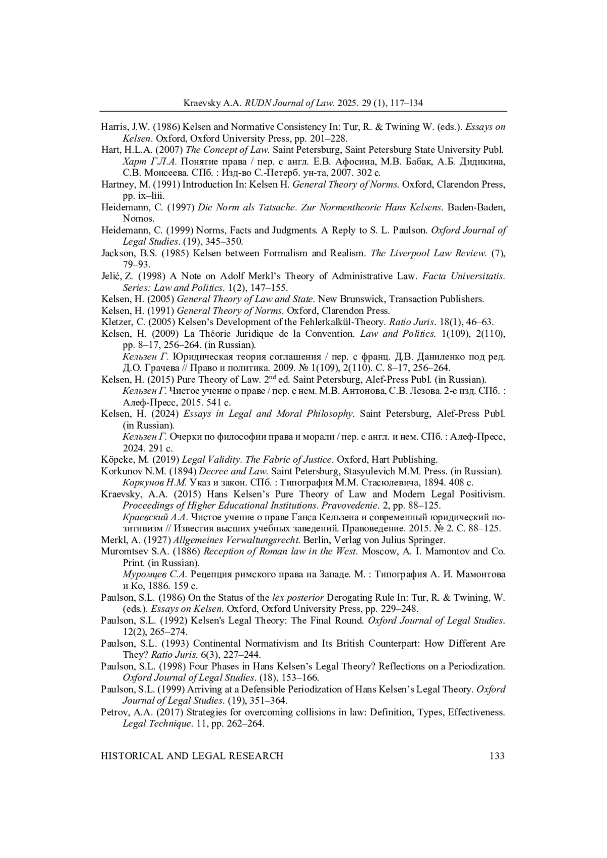 35. Paulson, S.L. (1999) Arriving at a Defensible Periodization of Hans Kelsen’s Legal Theory. Oxford Journal of Legal Studies. (19), 351-364.