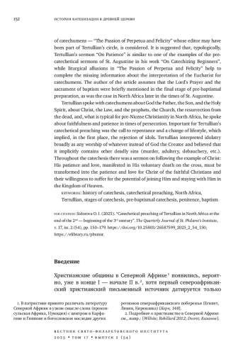 В статье исследуется структура и основное содержание катехизической проповеди Тертуллиана. Обосновывается утверждение, что для анализа вероучительной составляющей североафриканской катехизации в конце II - начале III в. наряду с трактатами «О зрелищах», «О покаянии», «О крещении» и «О молитве» нужно исследовать такие сочинения Тертуллиана, как «Об идолопоклонстве», «О терпении» и «К мученикам». Дополнительно рассматривается письменное свидетельство этого же периода о мученичестве катехуменов «Страсти свв. Перпетуи и Фелицитаты», составитель которого, возможно, входил в круг Тертуллиана. Выявлено типологическое сходство проповеди Тертуллиана «О терпении» и одного из образцов предогласительной проповеди блж. Августина в сочинении «Об обучении оглашаемых», а также высказано предположение, что литургические аллюзии в «Страстях свв. Перпетуи и Фелицитаты» помогают дополнить недостающие сведения о толковании евхаристии для оглашаемых. Автор статьи допускает, что о молитве Господней и таинстве крещения кратко говорилось на заключительной стадии предкрещальной подготовки, как это было в Северной Африке позднее во времена блж. Августина. Тертуллиан говорил с оглашаемыми о Боге - Отце, Сыне и Святом Духе, о Христе, Законе и пророках, Церкви, воскресении из мертвых и, что характерно для доникейского христианства в Северной Африке, - о верности и терпении во время гонений. Важное значение для катехизической проповеди Тертуллиана имел призыв к покаянию и изменению образа жизни, что предполагало в первую очередь отказ от идолослужения. Тертуллиан трактовал идолослужение расширительно как всякое поклонение чему-либо кроме Бога-Творца и считал, что оно имплицитно содержит в себе и другие смертные грехи (убийство, прелюбодеяние, разврат и др.). На протяжении всего оглашения звучала проповедь о подражании Христу: Его терпение и любовь, явленные в добровольной смерти на кресте, должны претвориться в терпение и любовь ко Христу самих верных христиан, в готовность пострадать за возможность соединения и пребывания с Ним в Небесном Царстве.