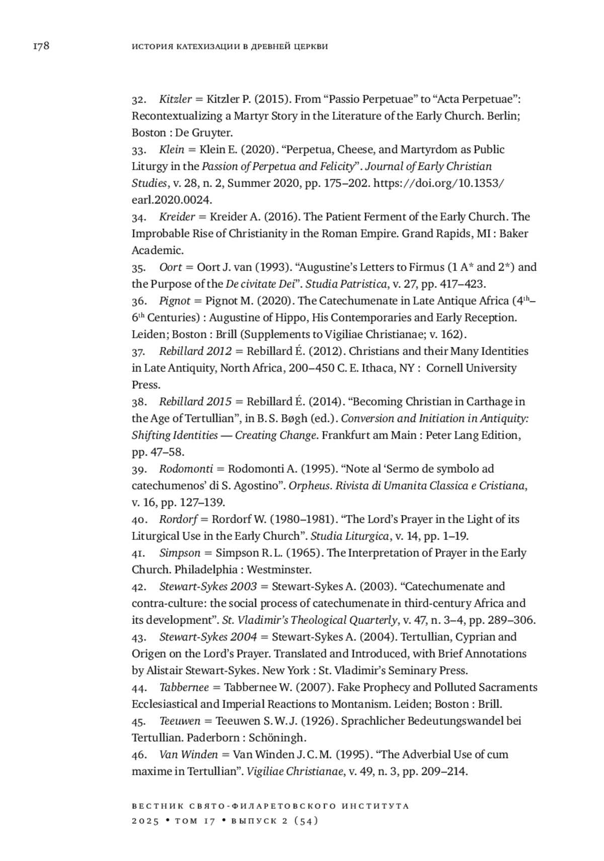 42. 	Stewart-Sykes A. (2003). “Catechumenate and contra-culture: the social process of catechumenate in third-century Africa and its development”. St. Vladimir’s Theological Quarterly, v. 47, n. 3-4, pp. 289-306.