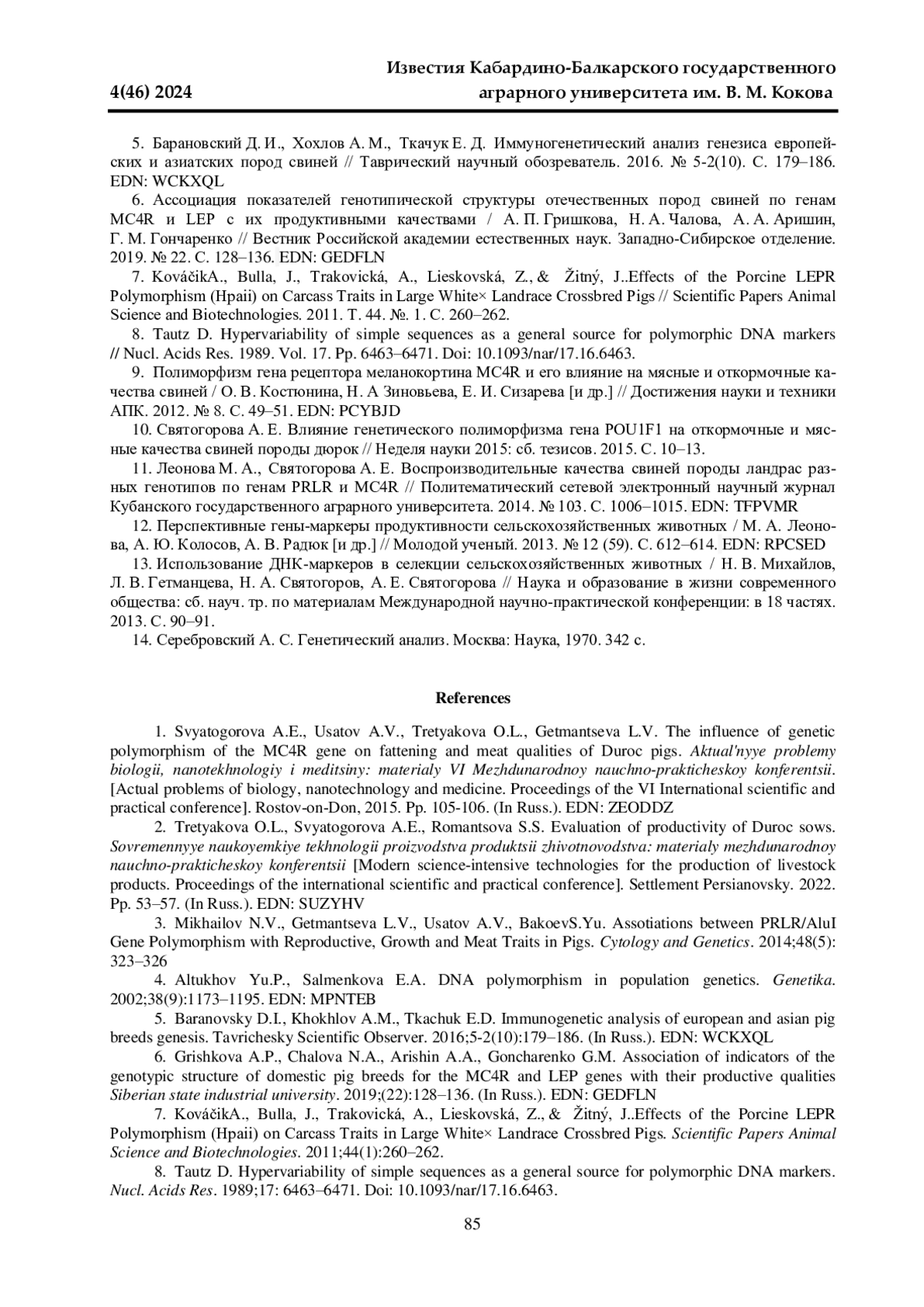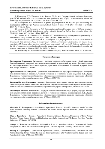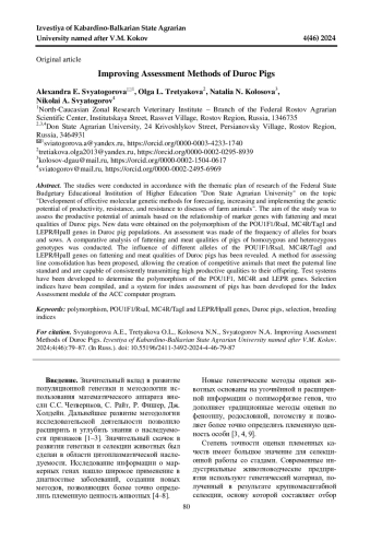 3. 	Mikhailov, N.V., Getmantseva L.V., Usatov A.V., BakoevS.Yu. Assotiations between PRLR/AluI Gene Polymorphism with Reproductive, Growth and Meat Traits in Pigs // Cytology and Genetics. 2014. Vol. 48. № 5. Pр. 323-326. EDN: UFHKXJ