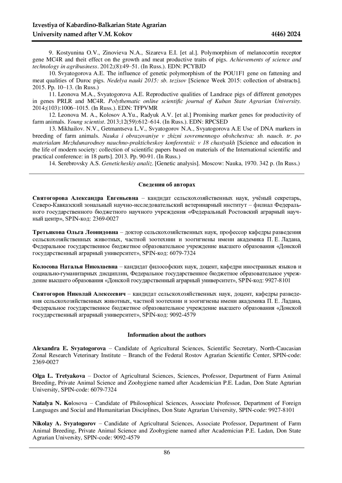 10. 	Святогорова А. Е. Влияние генетического полиморфизма гена POU1F1 на откормочные и мясные качества свиней породы дюрок // Неделя науки 2015: сб. тезисов. 2015. С. 10-13.