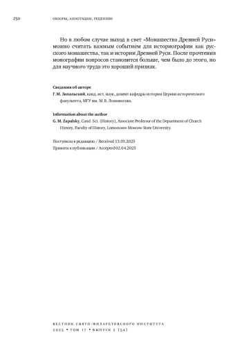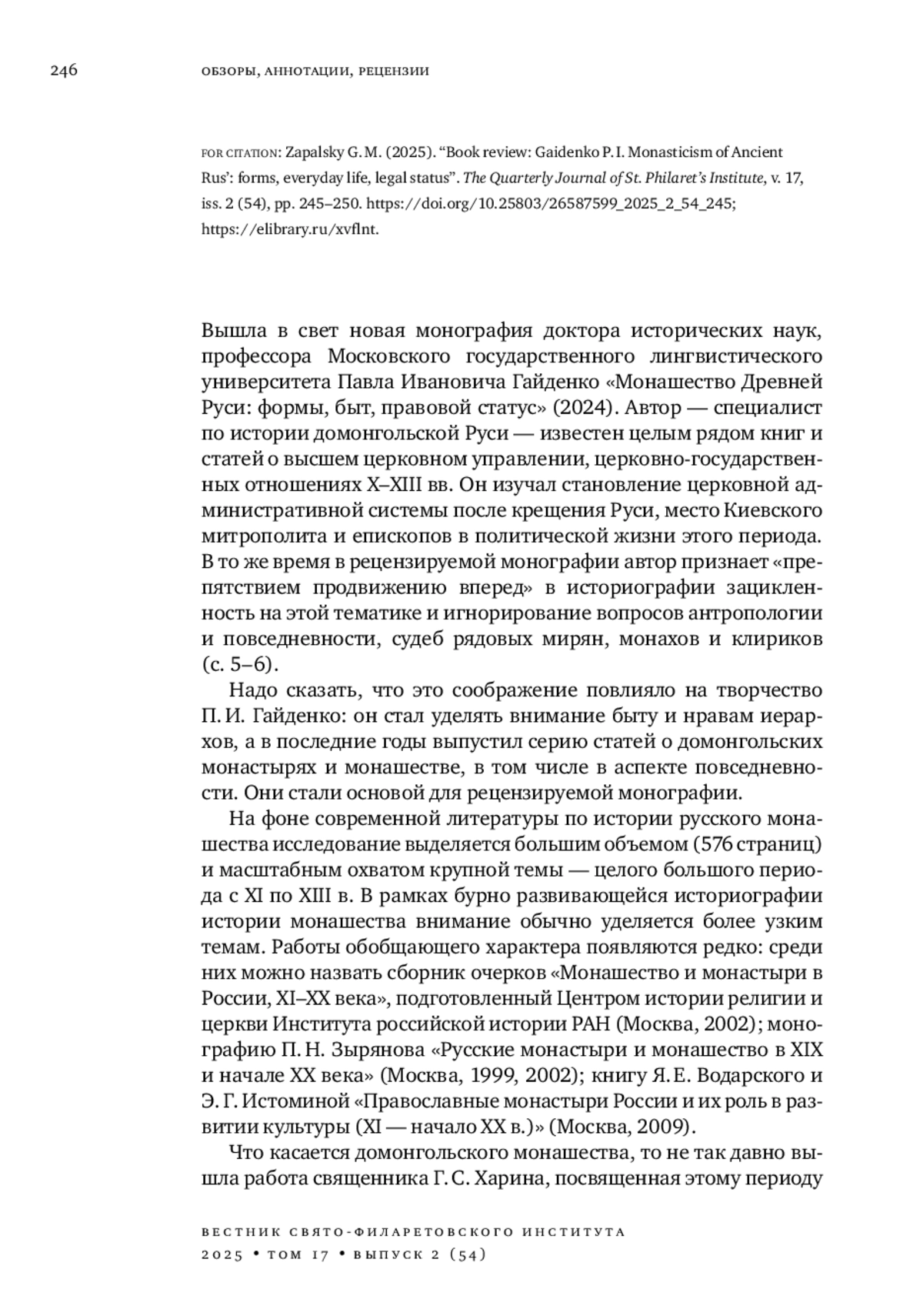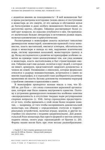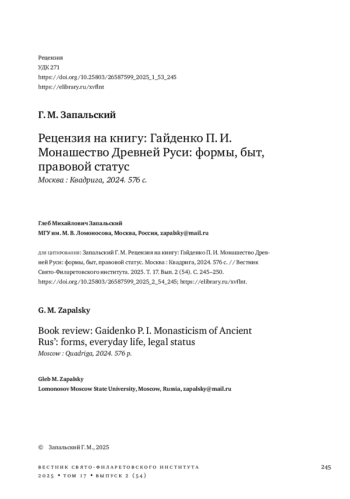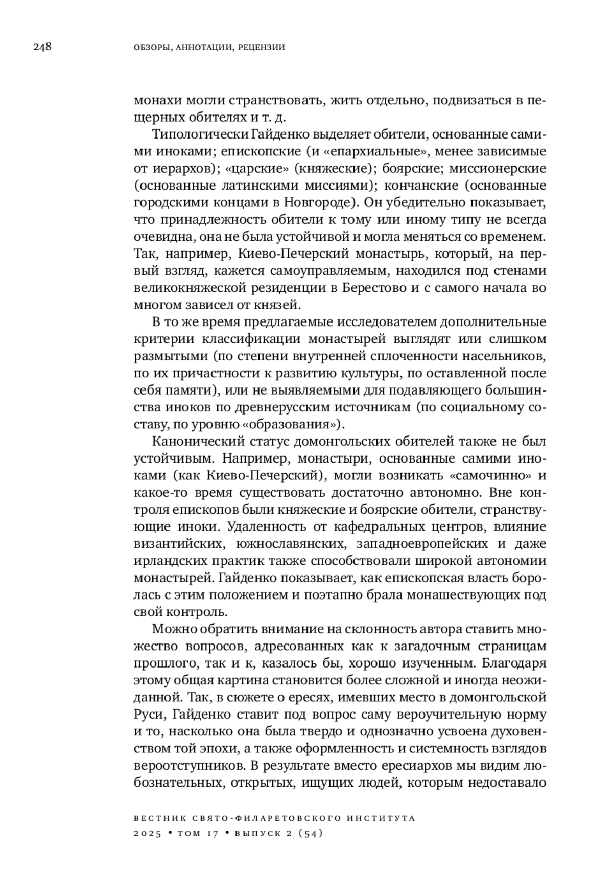 Вышла в свет новая монография доктора исторических наук, профессора Московского государственного лингвистического уни верситета Павла Ивановича Гайденко «Монашество Древней Руси: формы, быт, правовой статус» (2024). Автор — специалист по истории домонгольской Руси — известен целым рядом книг и статей о высшем церковном управлении, церковно-государственных отношениях X–XIII вв. Он изучал становление церковной административной системы после крещения Руси, место Киевского митрополита и епископов в политической жизни этого периода. В то же время в рецензируемой монографии автор признает «препятствием продвижению вперед» в историографии зацикленность на этой тематике и игнорирование вопросов антропологии и повседневности, судеб рядовых мирян, монахов и клириков (с. 5–6).