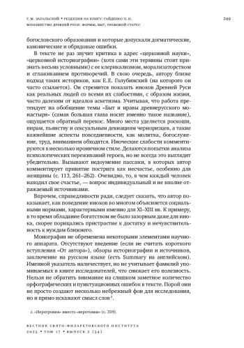Надо сказать, что это соображение повлияло на творчество П. И. Гайденко: он стал уделять внимание быту и нравам иерархов, а в последние годы выпустил серию статей о домонгольских монастырях и монашестве, в том числе в аспекте повседневности. Они стали основой для рецензируемой монографии.