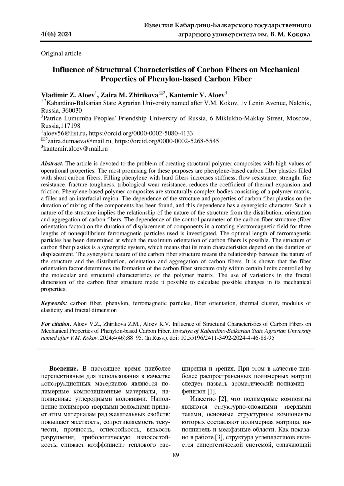Статья посвящена проблеме создания конструкционных полимерных композитов, обладающих высокими значениями эксплуатационных свойств. Наиболее перспективными для этих целей являются углепластики на основе фенилона, наполненные короткими углеродными волокнами. Наполнение фенилона твердыми волокнами повышает жесткость, сопротивляемость текучести, прочность, огнестойкость, вязкость разрушения, трибологическую износостойкость, снижает коэффициент теплового расширения и трения. Полимерные композиты на основе фенилона являются структурно сложными телами, состоящими из полимерной матрицы, наполнителя и межфазной области. Обнаружена зависимость структуры и свойств углепластиков от продолжительности смешения компонентов, причем эта зависимость имеет синергетический характер. Подобный характер структуры подразумевает взаимосвязь характера структуры с распределением, ориентацией и агрегацией углеродных волокон. Исследована зависимость управляющего параметра структуры углепластиков (фактора ориентации волокон) от продолжительности смещения компонентов во вращающемся электромагнитном поле для трех используемых длин неравновесных ферромагнитных частиц. Определена оптимальная длина ферромагнитных частиц, при которой возможна максимальная ориентация углеродных волокон в полимерной матрице. Показано, что фактор ориентации волокон определяет формирование структуры углепластиков только в определенных пределах, контролируемых молекулярными и структурными характеристиками полимерной матрицы. Использование вариации фрактальной размерности структуры углепластиков позволил рассчитать возможные изменения его механических свойств.