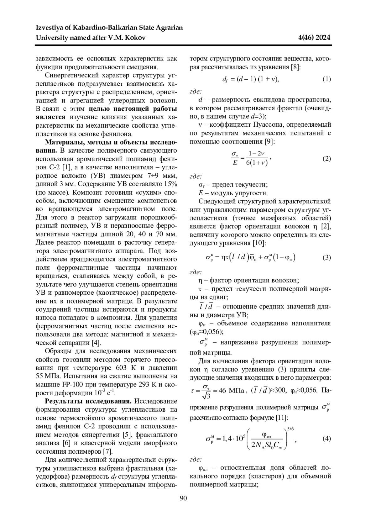 Интенсивное развитие современного сельскохозяйственного машиностроения требует разработки новых композиционных материалов на основе полимеров, обладающих высокими значениями эксплуатационных свойств. Улучшение эксплуатационных характеристик обеспечивается введением в полимерную матрицу упрочняющих добавок. Перспективными материалами для этих целей являются углеродные волокна. Введение углеродных волокон в полимер способствует созданию высокомолекулярного полимерного материала. В качестве матричного полимера использован фенилон, получаемый на основе ароматических полиамидов. Преимущество фенилона заключается в том, что материалы на его основе сочетают высокую тепло- и термостойкость с морозостойкостью, жесткость и прочность с хорошими антифрикционными свойствами, что обеспечивает возможность их широкого применения в сельскохозяйственном машиностроении. Исследованы механические свойства углепластиков на основе фенилона, наполненного углеродным волокном. В рамках фрактального анализа получены корреляционные зависимости между модулем упругости исследованных углепластиков и фрактальной размерностью областей локализации избыточной энергии, которая «закачивается» в полимерную матрицу. Показана возможность существенной вариации модуля упругости при постоянном содержании наполнителя за счет структурных изменений. Увеличение «закачиваемой» в полимерную матрицу энергии или степени ее «возмущения», характеризуемое повышением размерности областей локализации избыточной энергии, приводит к росту упругости, а усиление обратной связи в структуре углепластиков, означающее «перекачку» полимерного материала из одной плотноупакованной компоненты в другую, определяет снижение его величины.