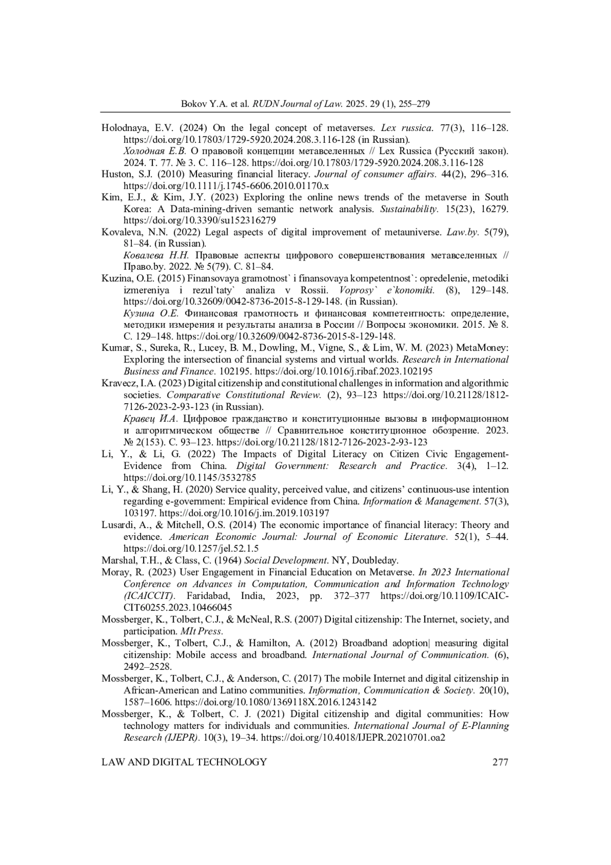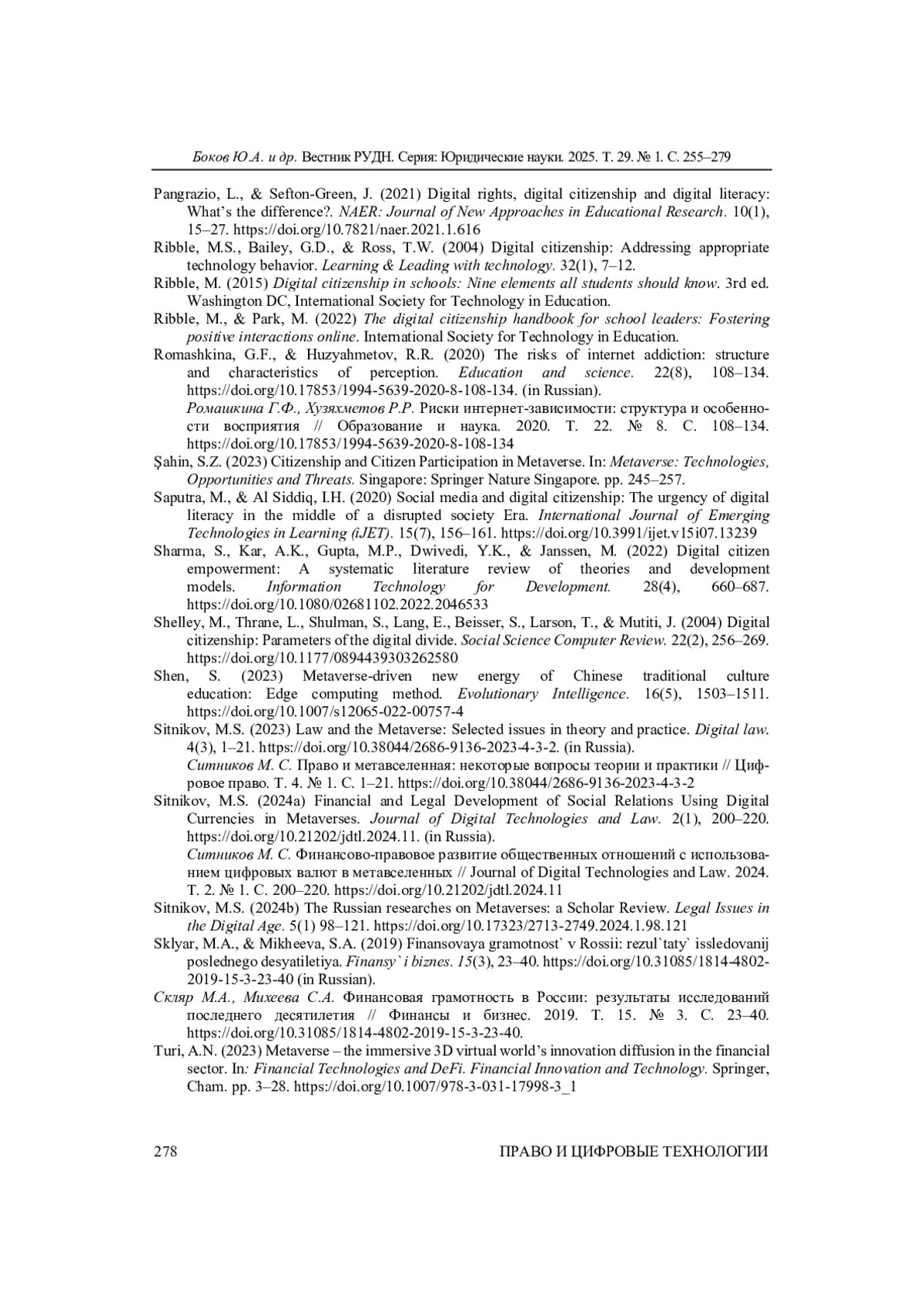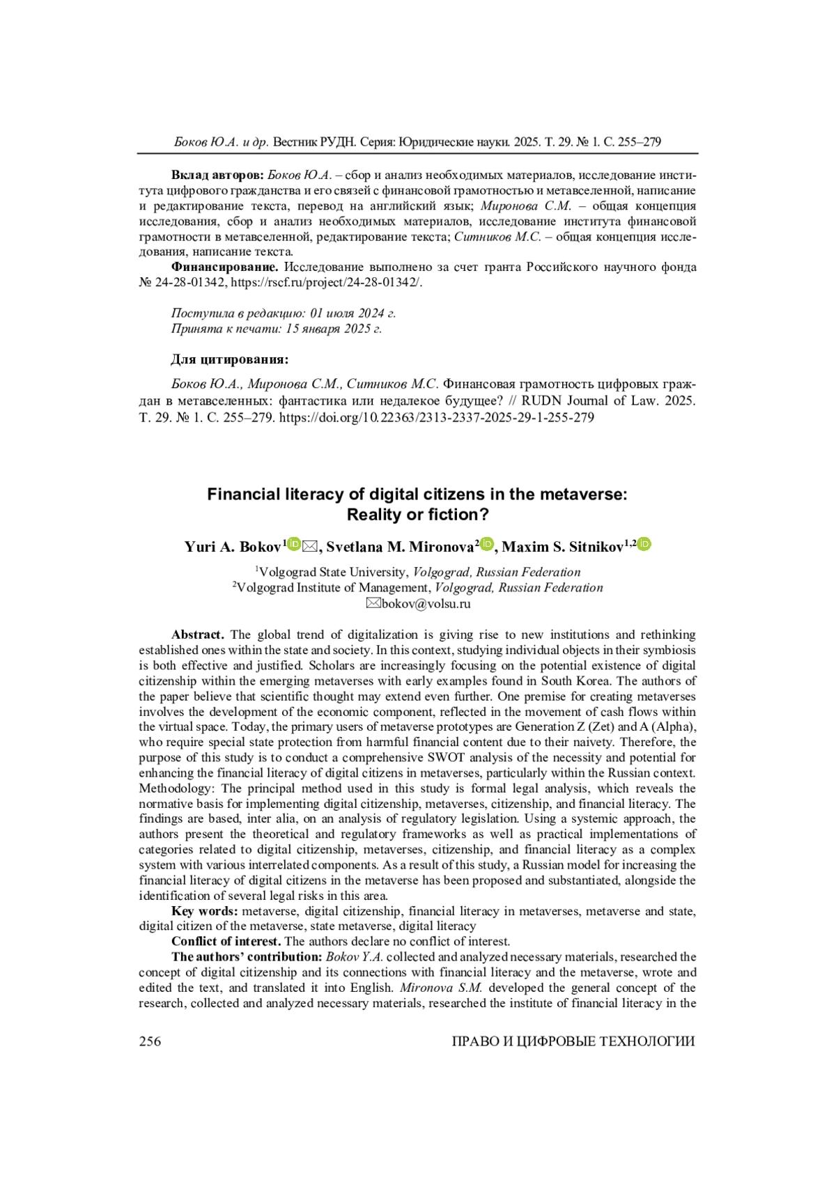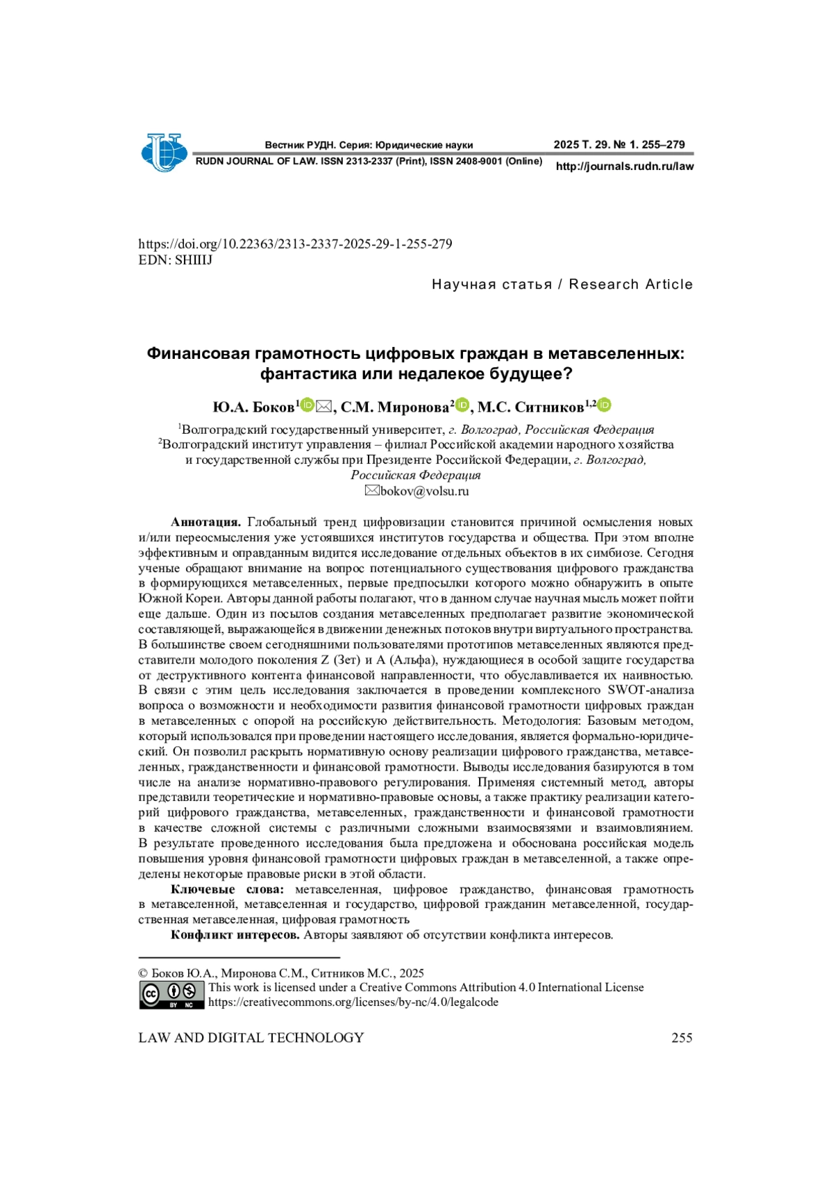 БОКОВ Ю. А., МИРОНОВА С. М., СИТНИКОВ М. С. ФИНАНСОВАЯ ГРАМОТНОСТЬ ЦИФРОВЫХ ГРАЖДАН В МЕТАВСЕЛЕННЫХ: ФАНТАСТИКА ИЛИ НЕДАЛЕКОЕ БУДУЩЕЕ? // ВЕСТНИК РОССИЙСКОГО УНИВЕРСИТЕТА ДРУЖБЫ НАРОДОВ. СЕРИЯ: ЮРИДИЧЕСКИЕ НАУКИ. 2025. Т. 29 № 1