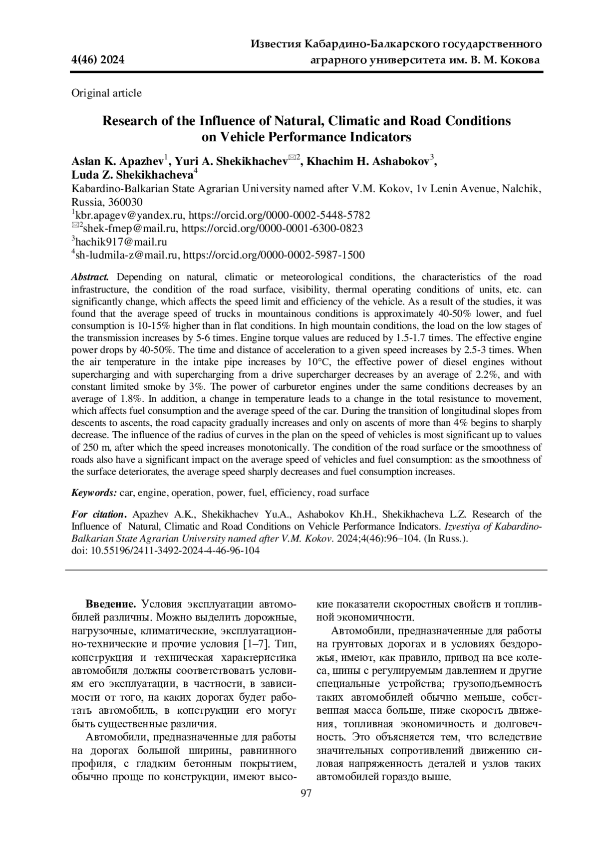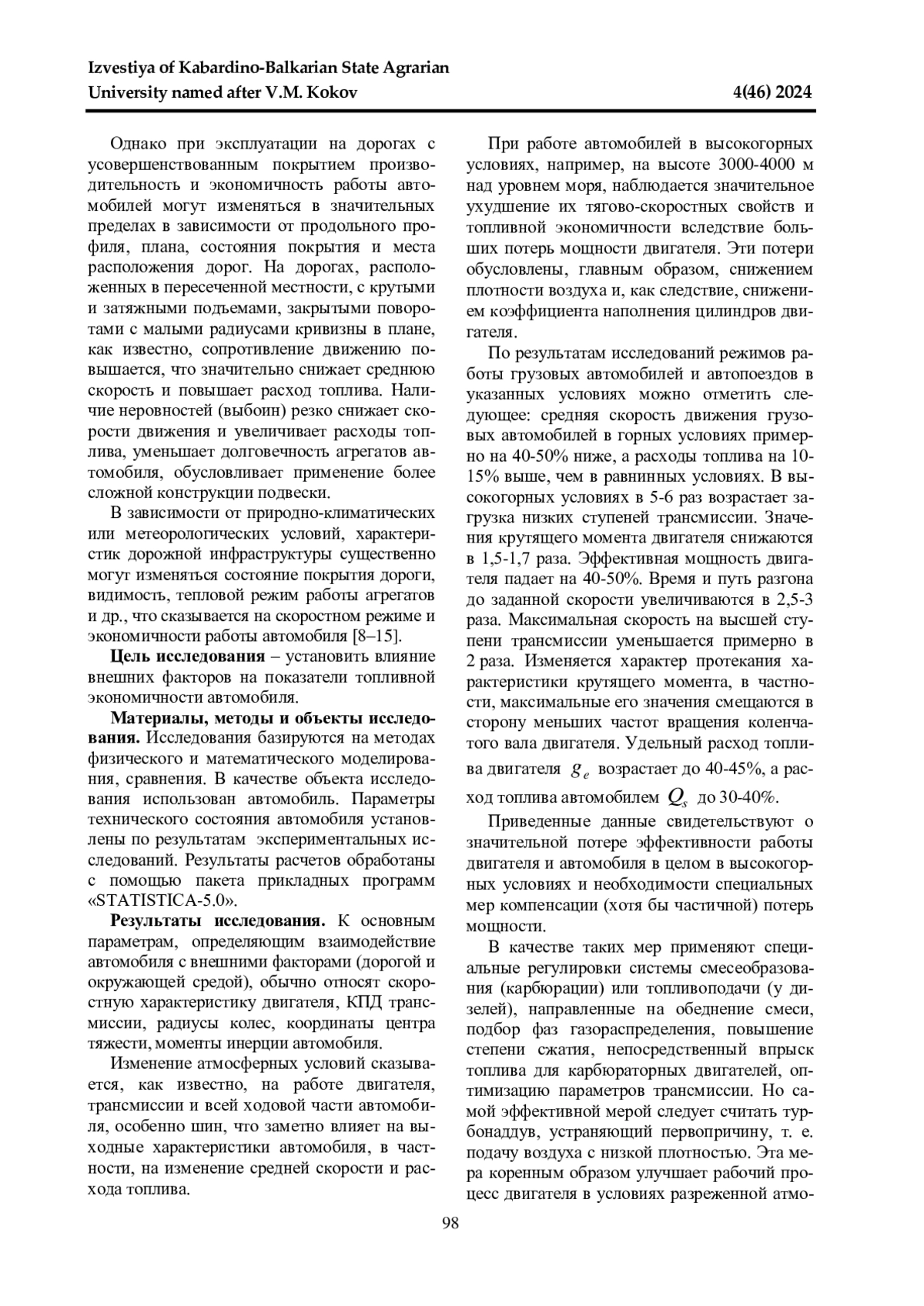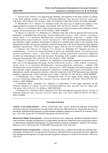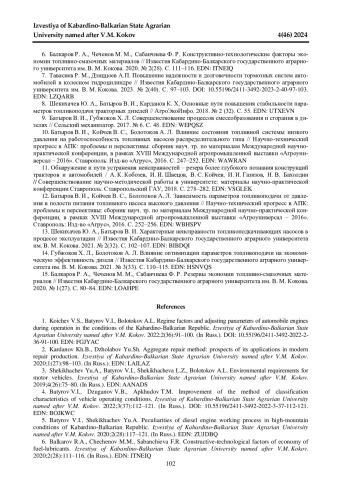 1. Койчев В. С., Батыров В. И., Болотоков А. Л. Режимные факторы и регулировочные параметры автомобильных двигателей при эксплуатации в условиях Кабардино-Балкарской Республики // Известия Кабардино-Балкарского государственного аграрного университета им. В. М. Кокова. 2022. № 2(36). С. 91-100. DOI: 10.55196/2411-3492-2022-2-36-91-100 EDN: FGJYAC