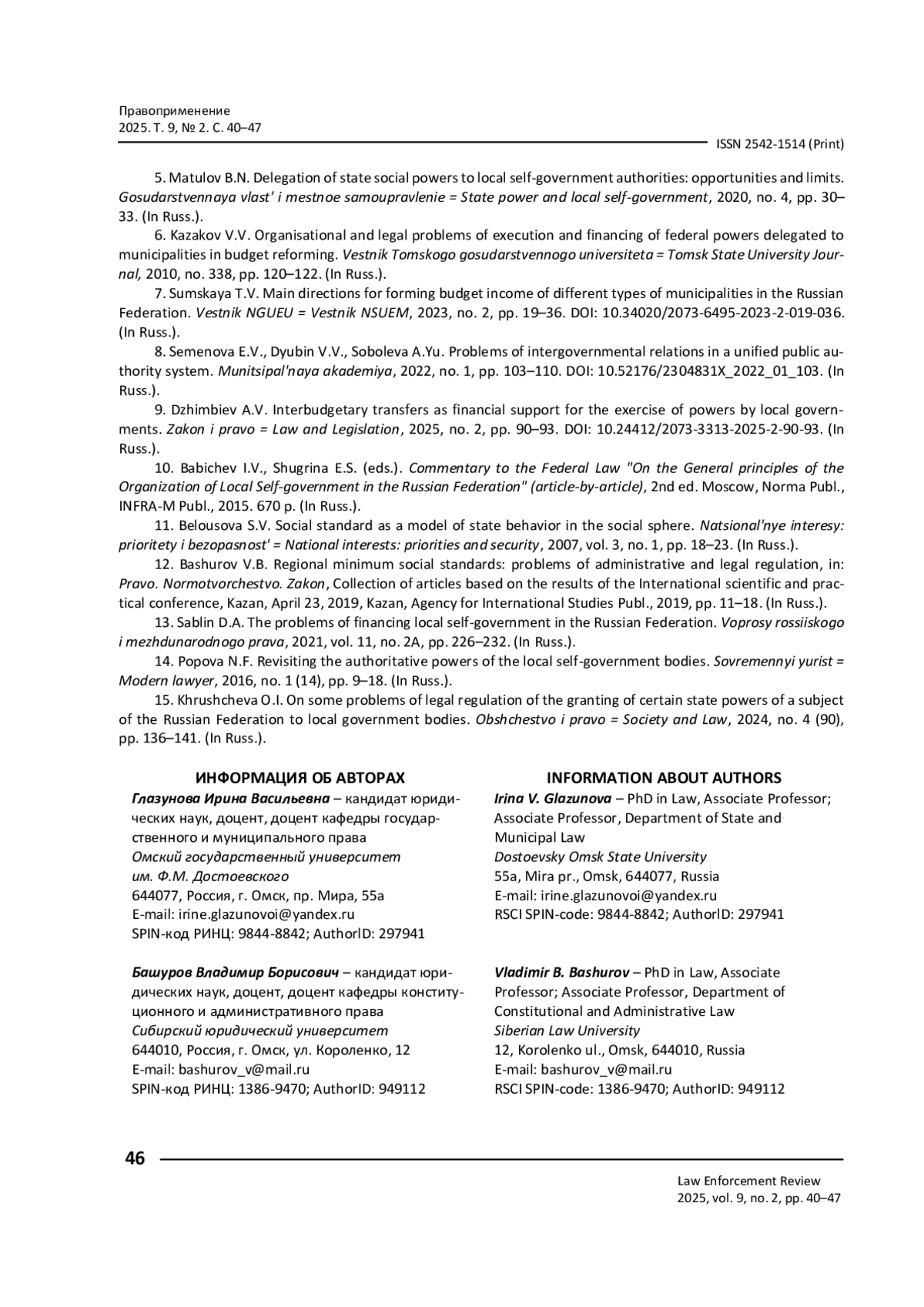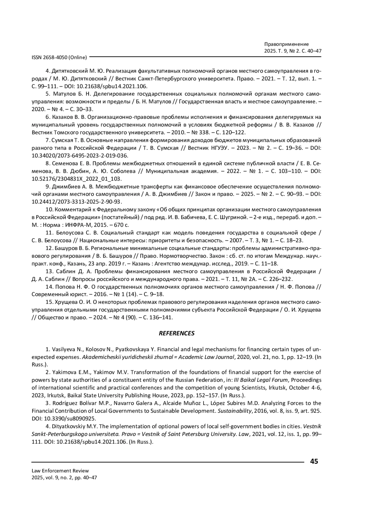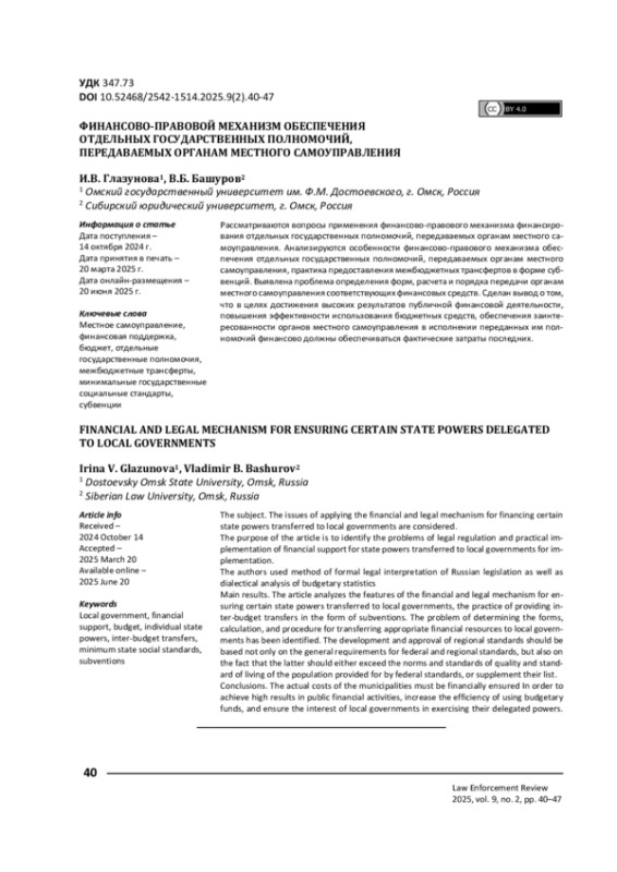 ГЛАЗУНОВА И. В., БАШУРОВ В. Б. ФИНАНСОВО-ПРАВОВОЙ МЕХАНИЗМ ОБЕСПЕЧЕНИЯ ОТДЕЛЬНЫХ ГОСУДАРСТВЕННЫХ ПОЛНОМОЧИЙ, ПЕРЕДАВАЕМЫХ ОРГАНАМ МЕСТНОГО САМОУПРАВЛЕНИЯ // ПРАВОПРИМЕНЕНИЕ. 2025. ТОМ 9, № 2
