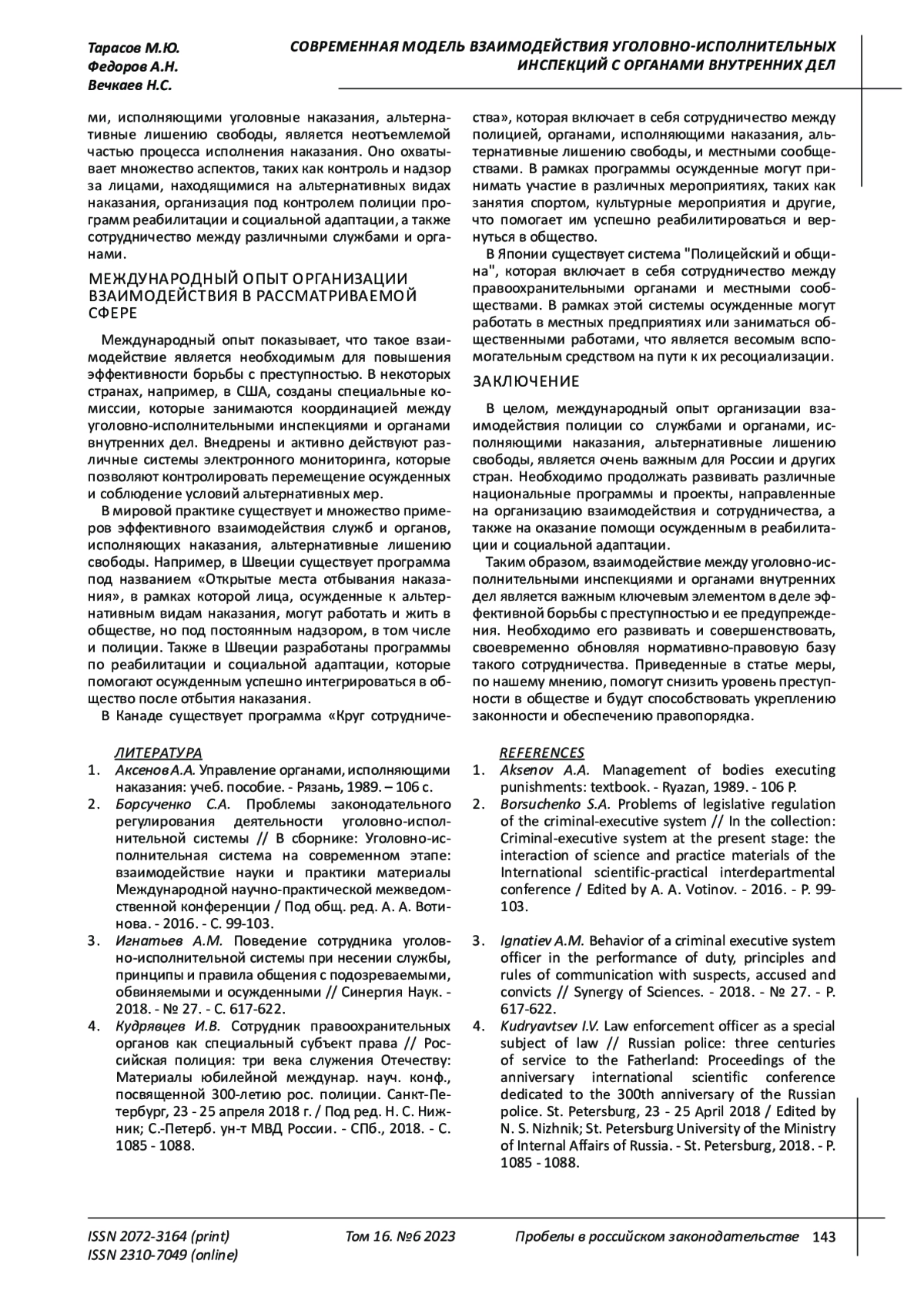 ВЕЧКАЕВ Н. С., ФЕДОРОВ А. Н., ТАРАСОВ М. Ю. СОВРЕМЕННАЯ МОДЕЛЬ ВЗАИМОДЕЙСТВИЯ УГОЛОВНО-ИСПОЛНИТЕЛЬНЫХ ИНСПЕКЦИЙ С ОРГАНАМИ ВНУТРЕННИХ ДЕЛ // ПРОБЕЛЫ В РОССИЙСКОМ ЗАКОНОДАТЕЛЬСТВЕ. 2023. Т. 16 № 6