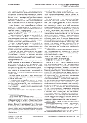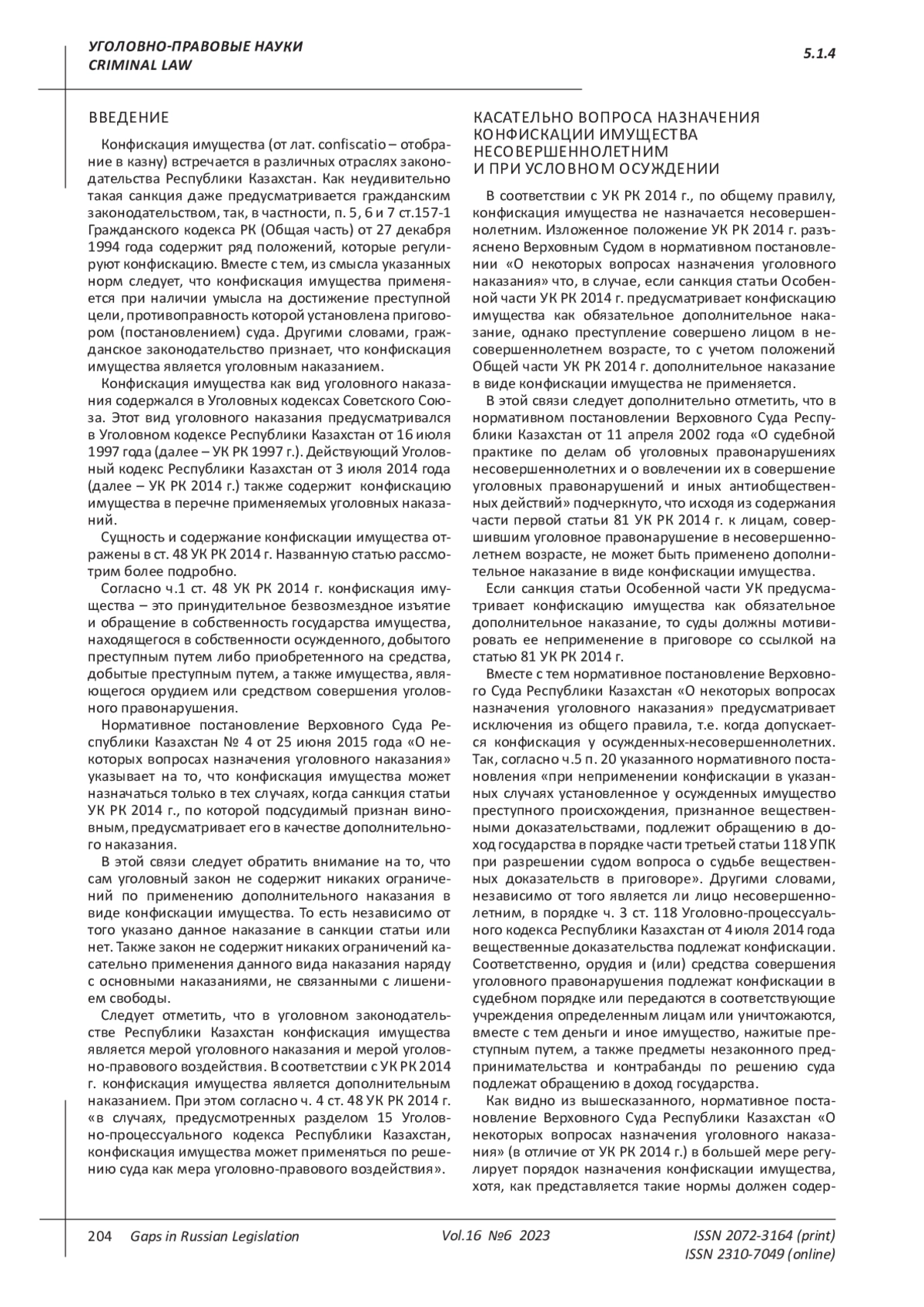 В соответствии с УК РК 2014 г., по общему правилу, конфискация имущества не назначается несовершеннолетним. Изложенное положение УК РК 2014 г. разъяснено Верховным Судом в нормативном постановлении «О некоторых вопросах назначения уголовного наказания» что, в случае, если санкция статьи Особенной части УК РК 2014 г. предусматривает конфискацию имущества как обязательное дополнительное наказание, однако преступление совершено лицом в несовершеннолетнем возрасте, то с учетом положений Общей части УК РК 2014 г. дополнительное наказание в виде конфискации имущества не применяется. В этой связи следует дополнительно отметить, что в нормативном постановлении Верховного Суда Республики Казахстан от 11 апреля 2002 года «О судебной практике по делам об уголовных правонарушениях несовершеннолетних и о вовлечении их в совершение уголовных правонарушений и иных антиобщественных действий» подчеркнуто, что исходя из содержания части первой статьи 81 УК РК 2014 г. к лицам, совершившим уголовное правонарушение в несовершеннолетнем возрасте, не может быть применено дополнительное наказание в виде конфискации имущества.