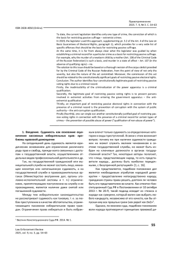 14. Рокитянский С. Г. Становление ограничения избирательных прав в связи с совершением преступлений различной степени тяжести в российском законодательстве / С. Г. Рокитянский // Избирательное законодательство и практика. - 2020. - № 4. - С. 8-11.