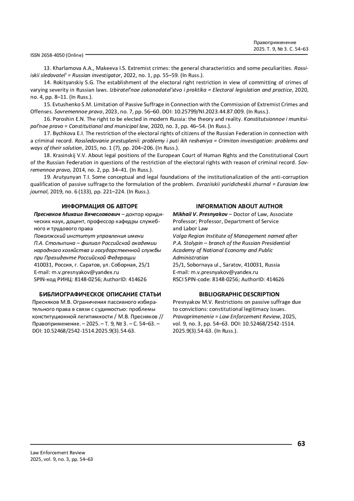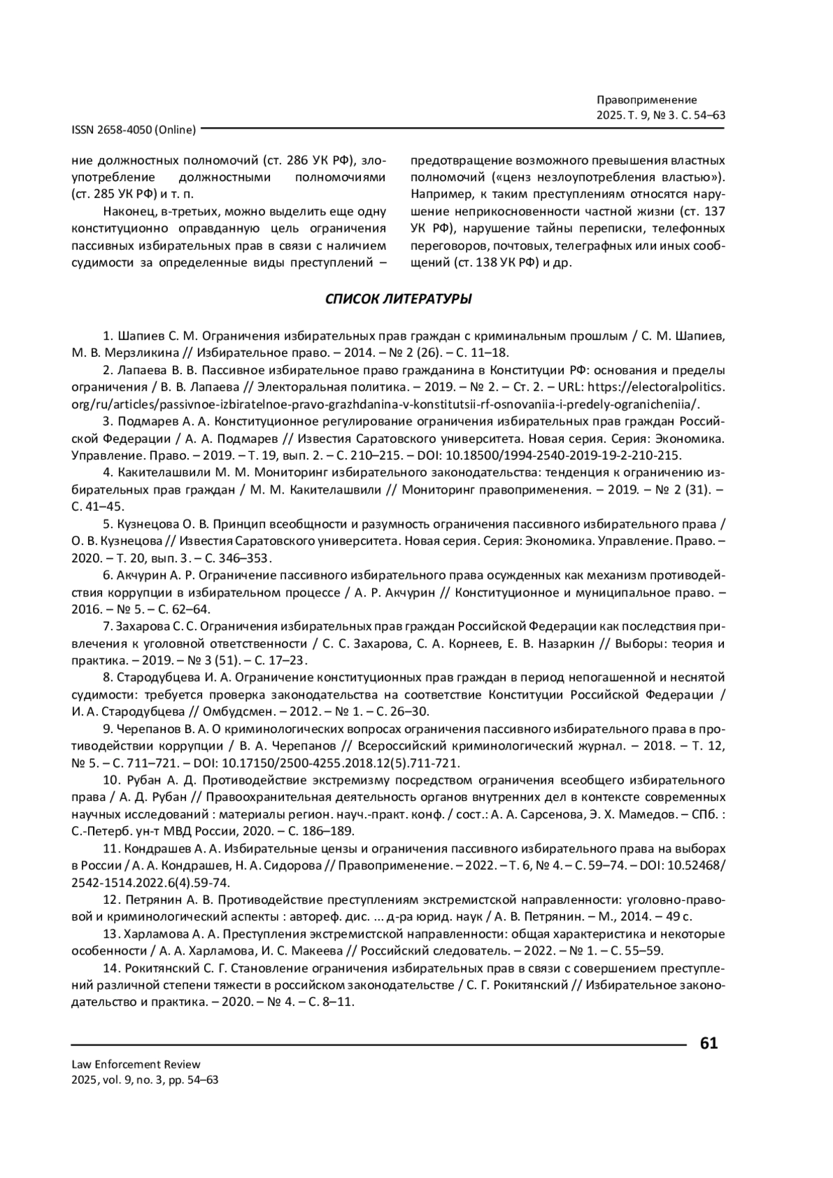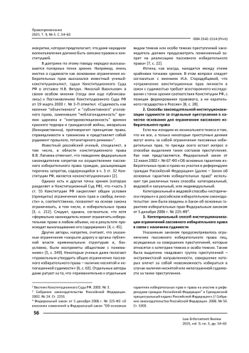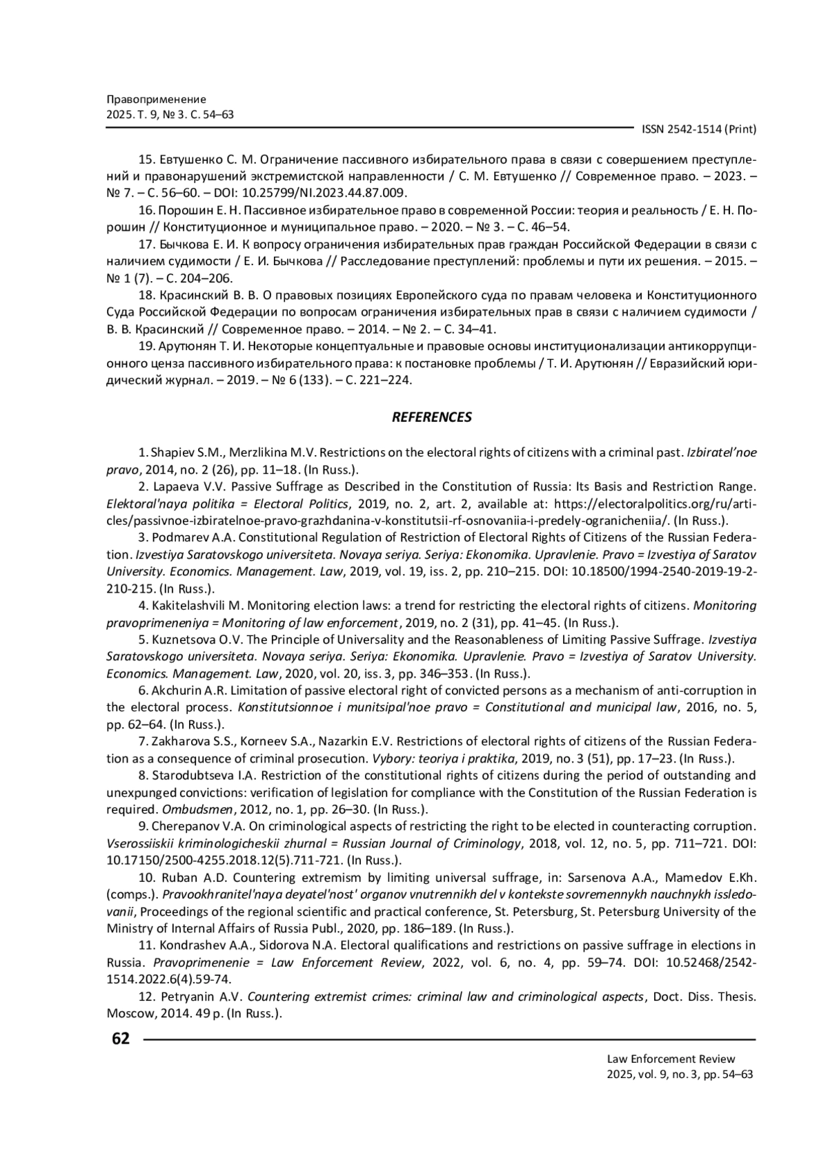 15. Евтушенко С. М. Ограничение пассивного избирательного права в связи с совершением преступлений и правонарушений экстремистской направленности / С. М. Евтушенко // Современное право. - 2023. - № 7. - С. 56-60. - https://doi.org/10.25799/NI.2023.44.87.009.