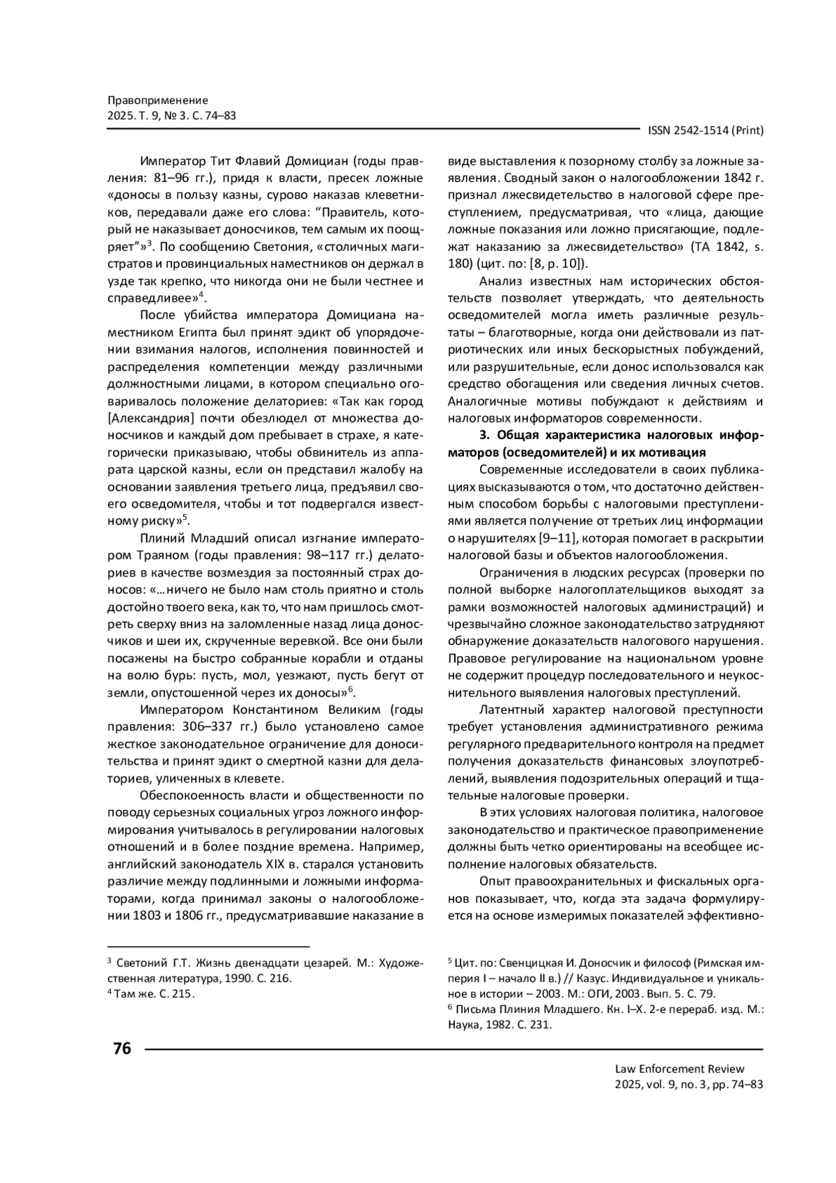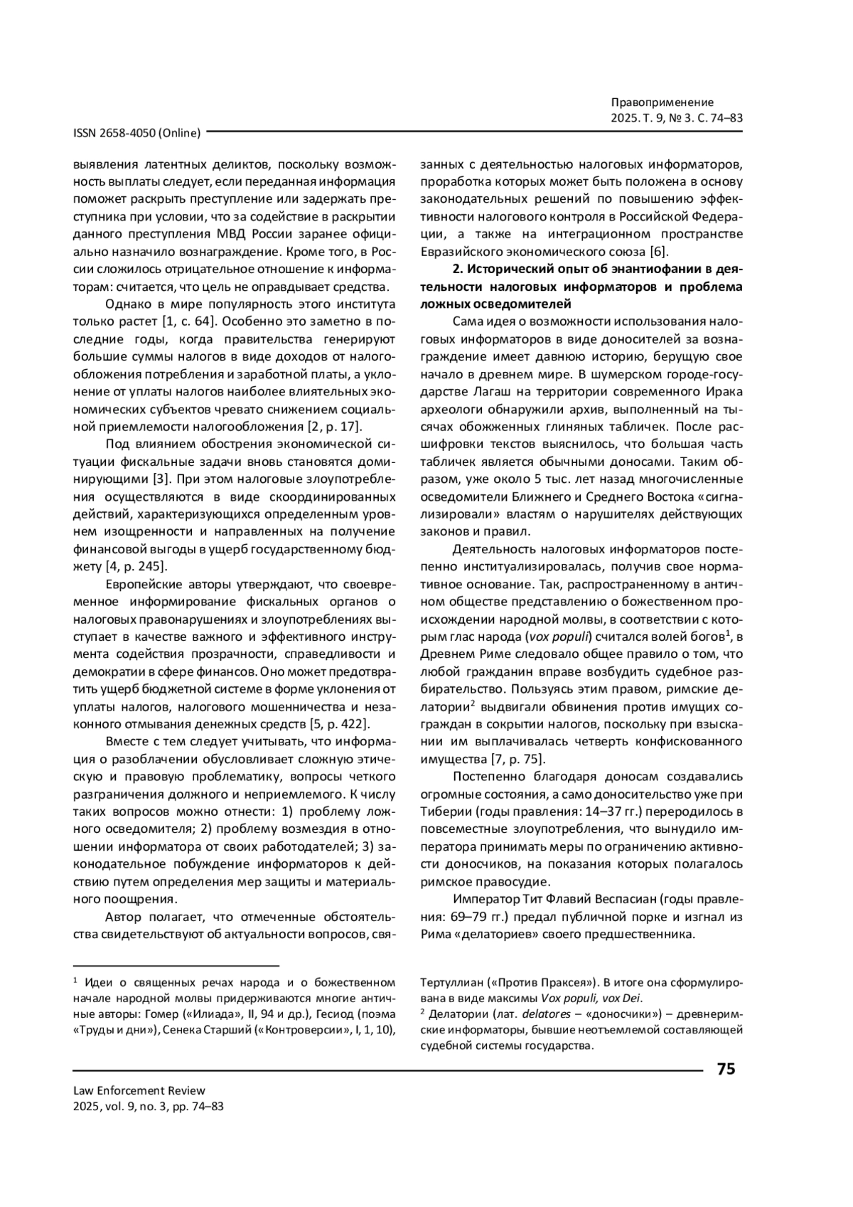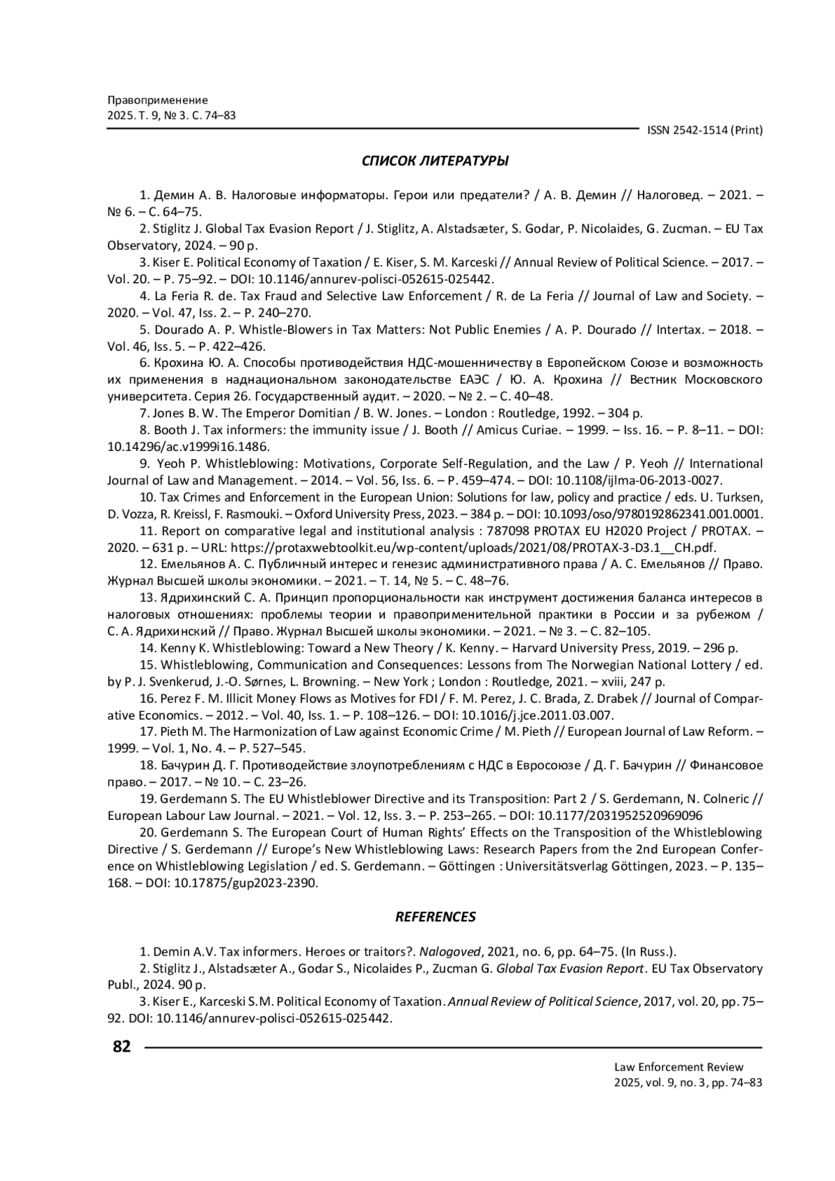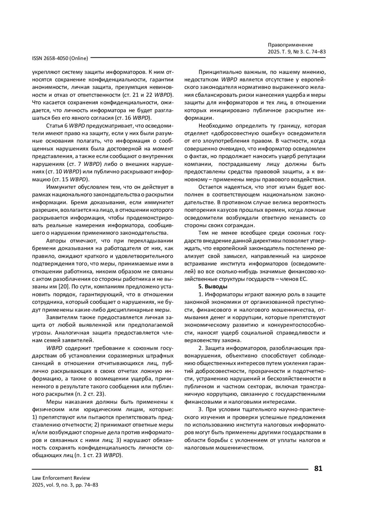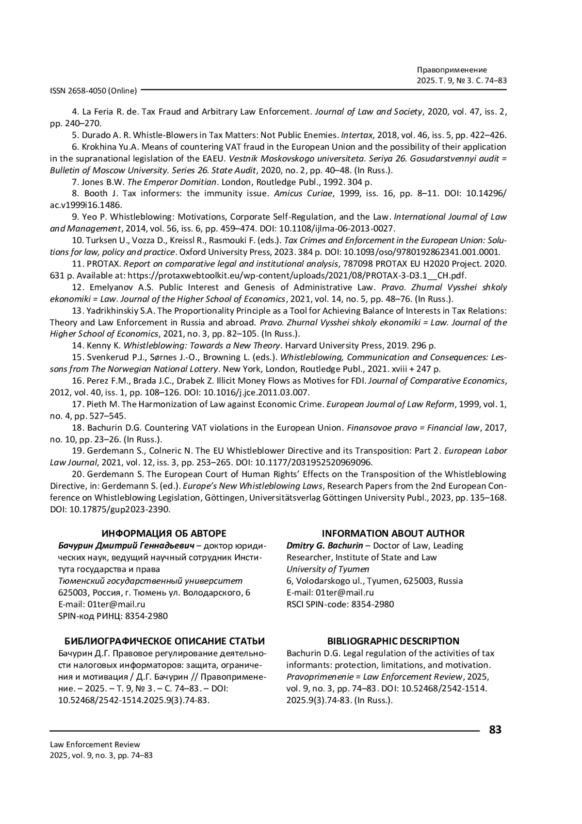 БАЧУРИН Д. Г. ПРАВОВОЕ РЕГУЛИРОВАНИЕ ДЕЯТЕЛЬНОСТИ НАЛОГОВЫХ ИНФОРМАТОРОВ: ЗАЩИТА, ОГРАНИЧЕНИЯ И МОТИВАЦИЯ // ПРАВОПРИМЕНЕНИЕ. 2025. ТОМ 9, № 3