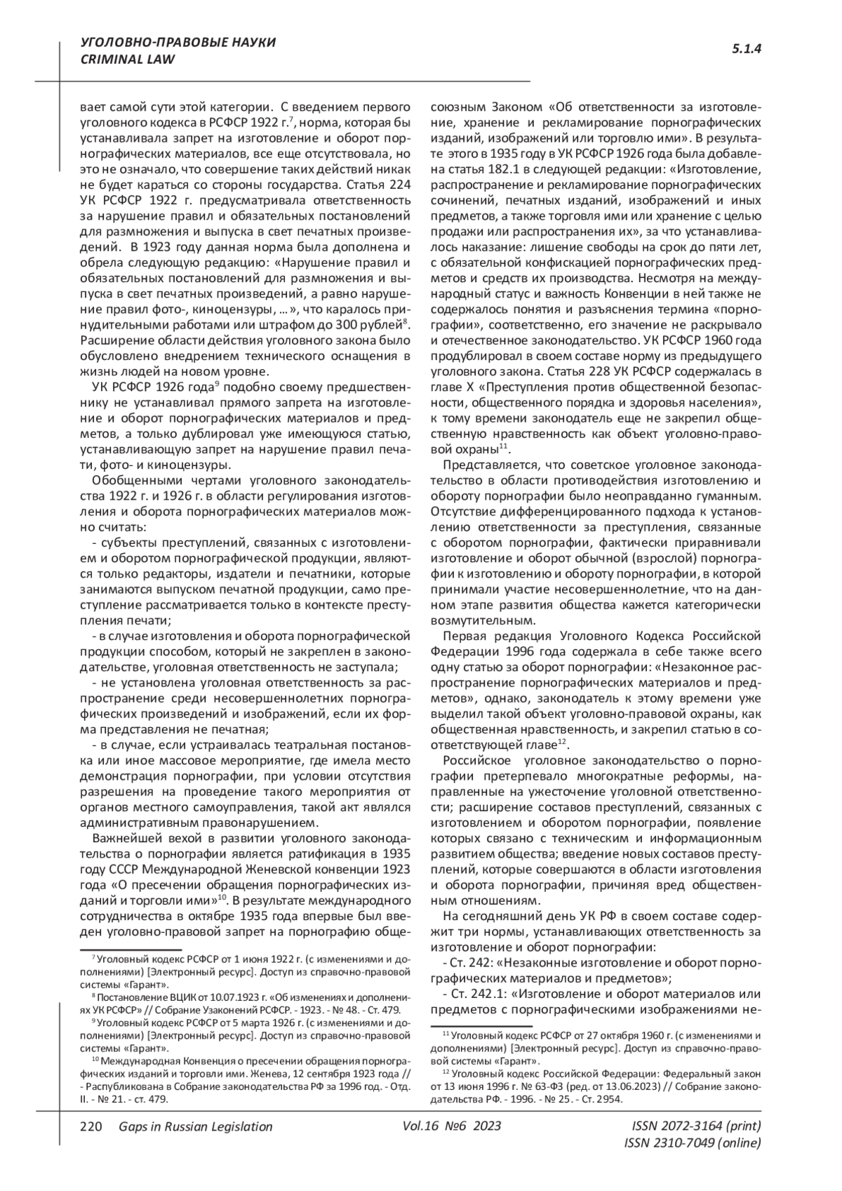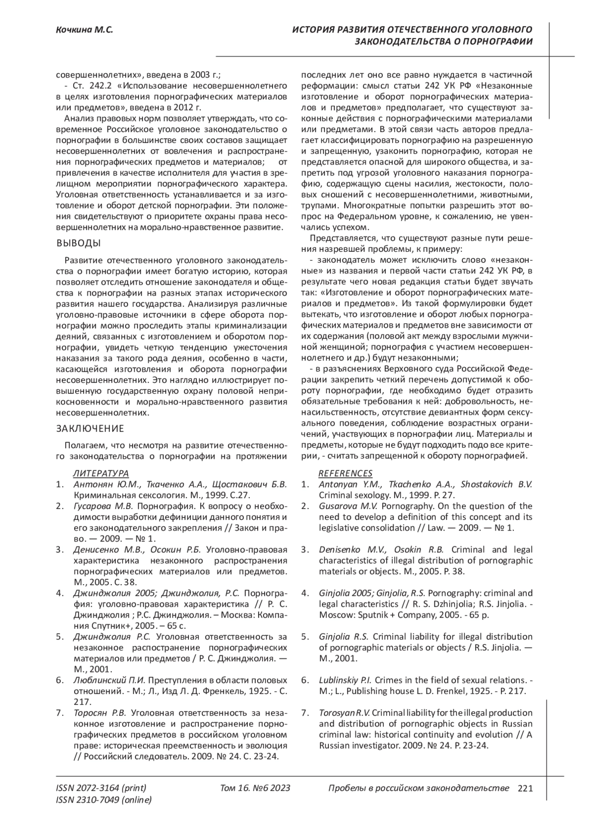 Torosyan R.V. Criminal liability for the illegal production and distribution of pornographic objects in Russian criminal law: historical continuity and evolution // A Russian investigator. 2009. № 24. P. 23-24.