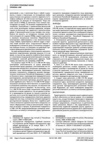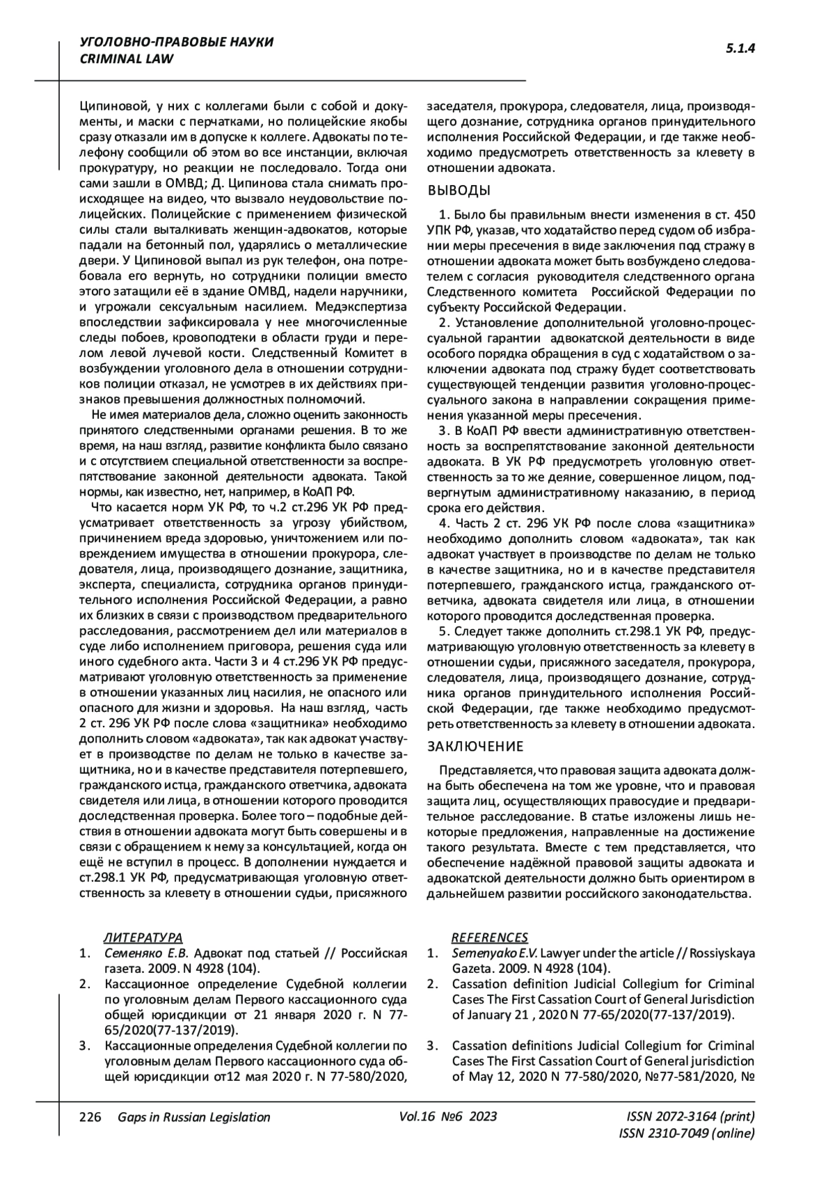 Возникают вопросы и в связи с гарантиями личной неприкосновенности адвоката. Урванский районный суд в Кабардино-Балкарии оправдал адвоката Диану Ципинову по обвинению в насилии по отношению к сотруднику полиции (ч. 1 ст. 318 УК РФ). В 2020 году трех женщин-адвокатов в КБР не допустили к задержанному коллеге Ратмиру Жилокову, грубо вышвырнув их из отдела полиции. Следственный комитет отказался возбуждать дело в отношении сотрудников МВД, но на скамье подсудимых оказались сами адвокаты. В начале 2023 года суд признал Ратмира Жилокова виновным в нападении на полицейских, но теперь оправдал Диану Ципинову. Как пояснил ее защитник на суде, женщина дала пощечину сотруднику МВД, когда он «стал унижать ее женское достоинство и половую неприкосновенность»4. Уголовное дело в отношении адвоката Дианы Ципиновой было возбуждено в мае 2020 года.