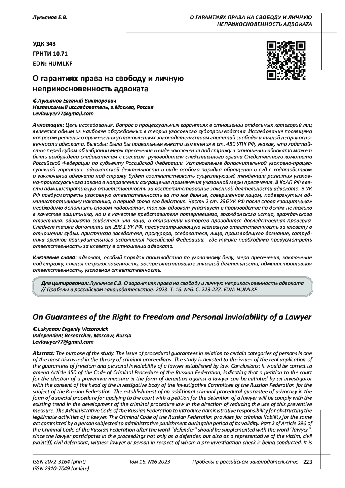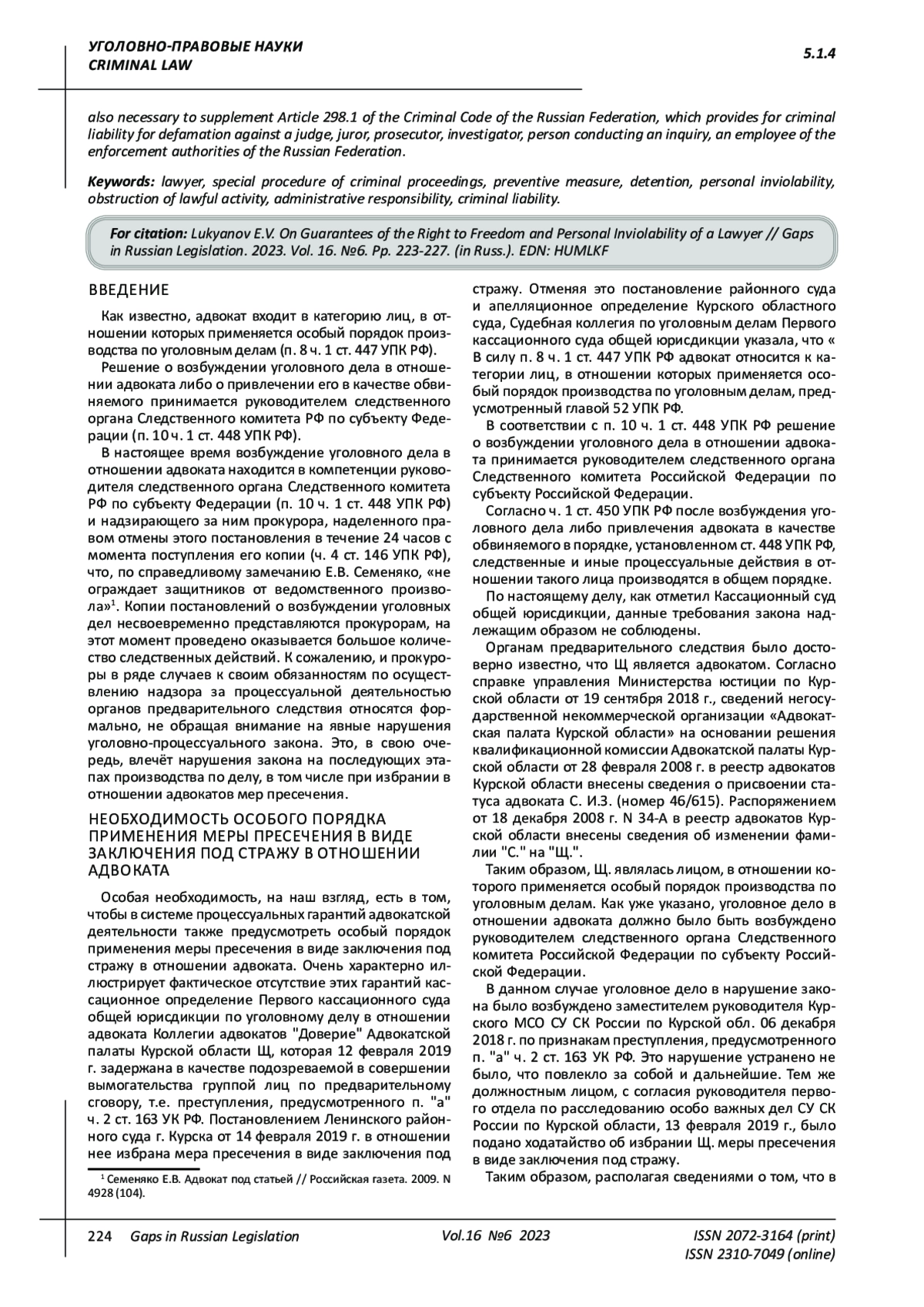 Цель исследования. Вопрос о процессуальных гарантиях в отношении отдельных категорий лиц является одним из наиболее обсуждаемых в теории уголовного судопроизводства. Исследование посвящено вопросам реального применения установленных законодательством гарантий свободы и личной неприкосновенности адвоката. Выводы: Было бы правильным внести изменения в ст. 450 УПК РФ, указав, что ходатайство перед судом об избрании меры пресечения в виде заключения под стражу в отношении адвоката может быть возбуждено следователем с согласия руководителя следственного органа Следственного комитета Российской Федерации по субъекту Российской Федерации. Установление дополнительной уголовно-процессуальной гарантии адвокатской деятельности в виде особого порядка обращения в суд с ходатайством о заключении адвоката под стражу будет соответствовать существующей тенденции развития уголовно-процессуального закона в направлении сокращения применения указанной меры пресечения. В КоАП РФ ввести административную ответственность за воспрепятствование законной деятельности адвоката. В УК РФ предусмотреть уголовную ответственность за то же деяние, совершенное лицом, подвергнутым административному наказанию, в период срока его действия. Часть 2 ст. 296 УК РФ после слова «защитника» необходимо дополнить словом «адвоката», так как адвокат участвует в производстве по делам не только в качестве защитника, но и в качестве представителя потерпевшего, гражданского истца, гражданского ответчика, адвоката свидетеля или лица, в отношении которого проводится доследственная проверка. Следует также дополнить ст.298.1 УК РФ, предусматривающую уголовную ответственность за клевету в отношении судьи, присяжного заседателя, прокурора, следователя, лица, производящего дознание, сотрудника органов принудительного исполнения Российской Федерации, где также необходимо предусмотреть ответственность за клевету в отношении адвоката.