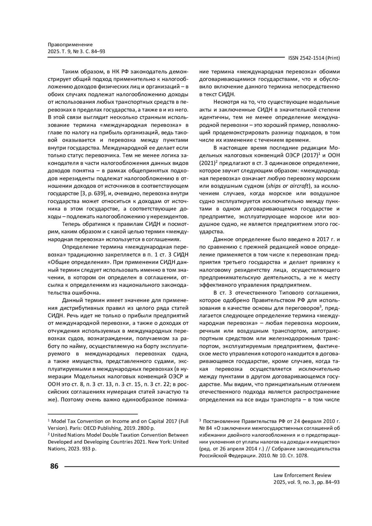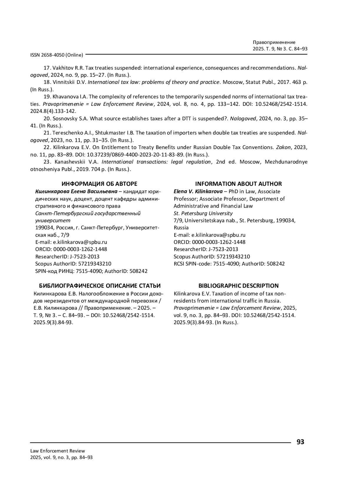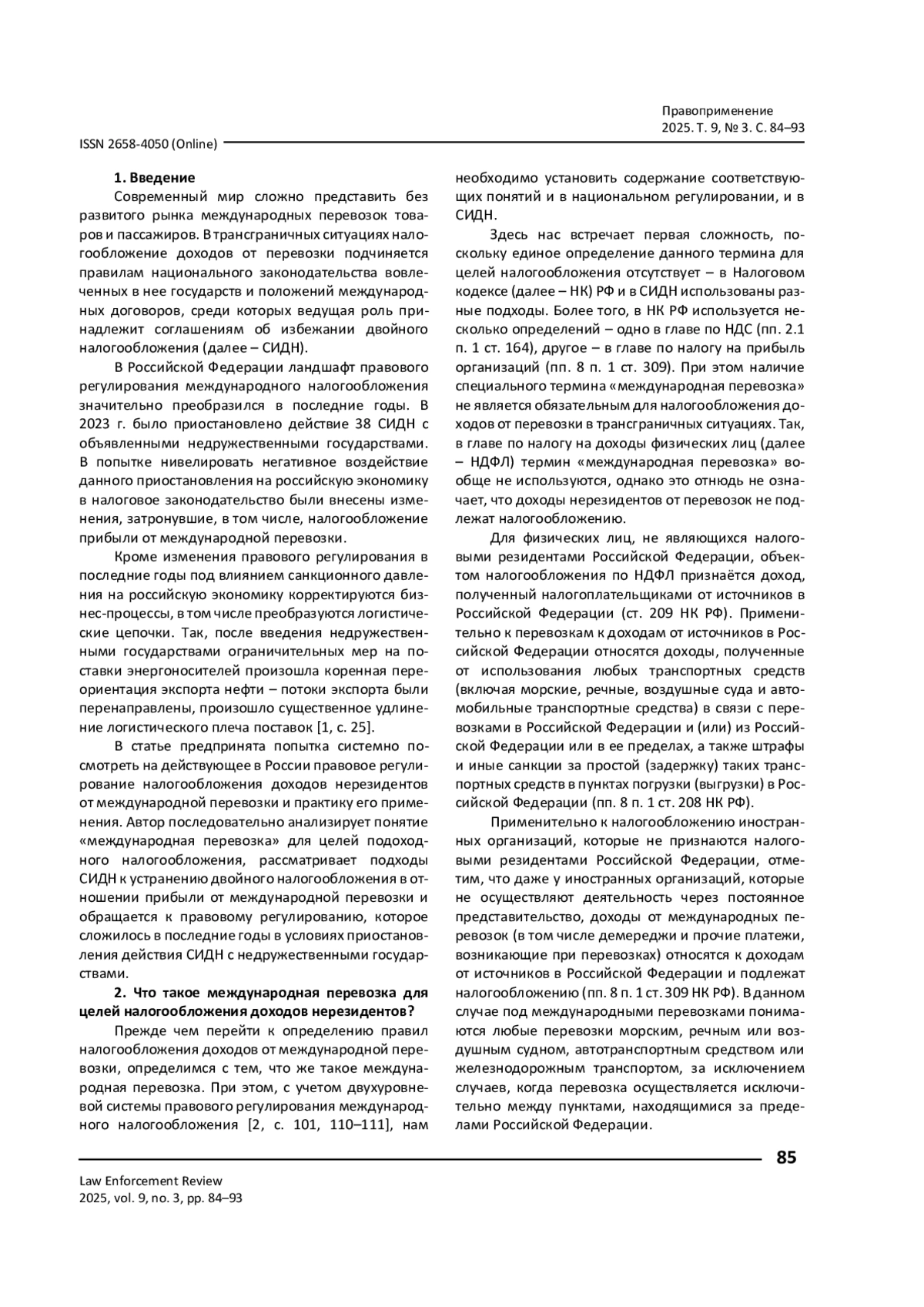 КИЛИНКАРОВА Е. В. НАЛОГООБЛОЖЕНИЕ В РОССИИ ДОХОДОВ НЕРЕЗИДЕНТОВ ОТ МЕЖДУНАРОДНОЙ ПЕРЕВОЗКИ // ПРАВОПРИМЕНЕНИЕ. 2025. ТОМ 9, № 3