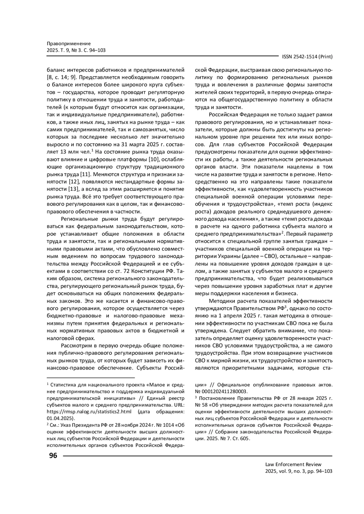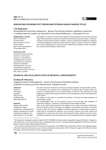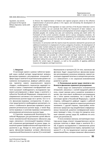 Исследуются особенности финансово-правового регулирования региональных рынков труда. Обосновывается актуальность развития региональных рынков труда с учетом реализации национального проекта «Кадры», важность применения бюджетно-правовых и налогово-правовых инструментов для развития труда и занятости в регионах. Проводится анализ федеральных и региональных нормативных правовых актов, направленных на финансово-правовое обеспечение.