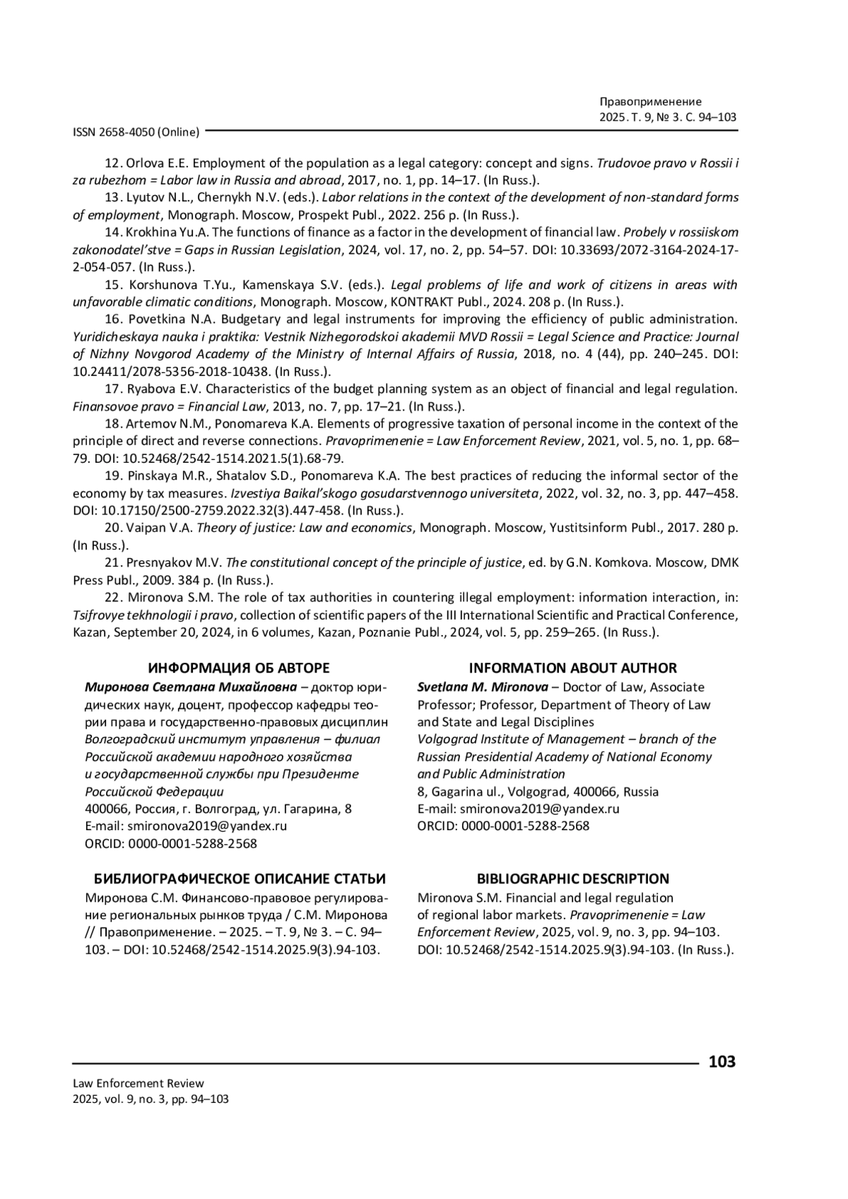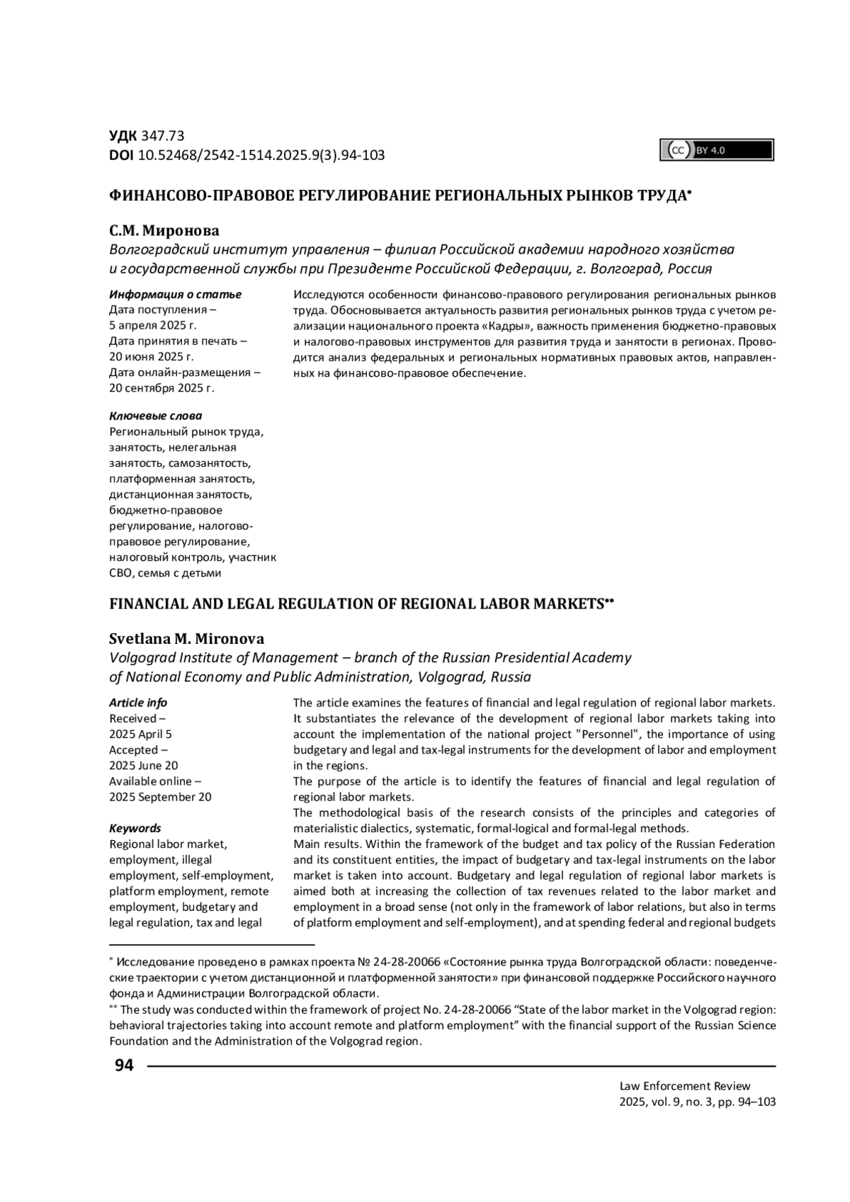 5. Миронова С. М. Правовое регулирование рынка труда Волгоградской области / С. М. Миронова // Парадигмы управления, экономики и права. - 2024. - № 3 (13). - С. 78-85.