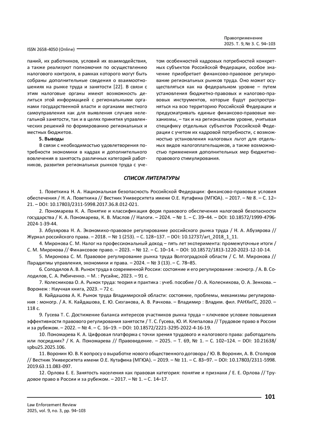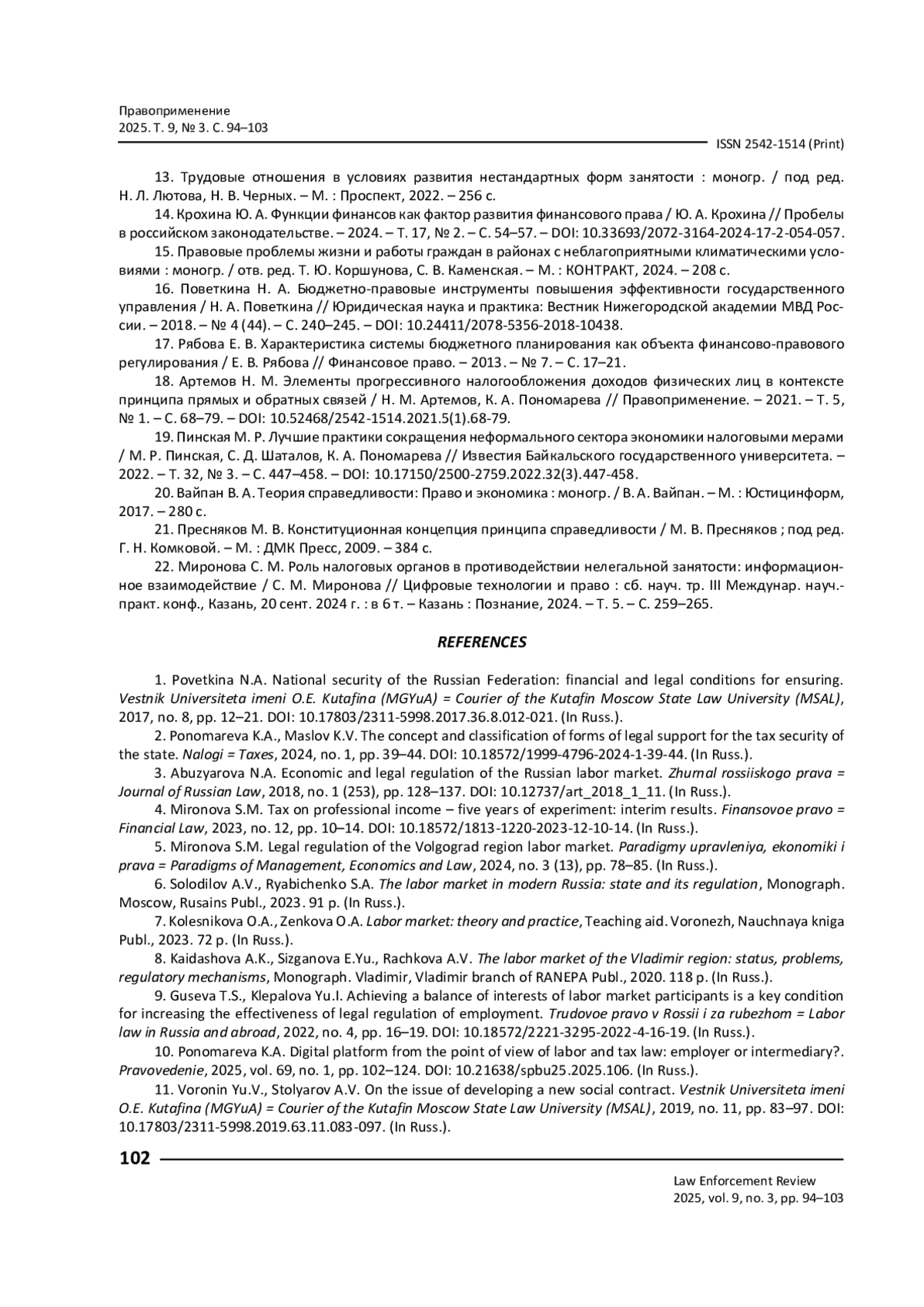10. Пономарева К. А. Цифровая платформа с точки зрения трудового и налогового права: работодатель или посредник? / К. А. Пономарева // Правоведение. - 2025. - Т. 69, № 1. - С. 102-124. - https://doi.org/10.21638/spbu25.2025.106.