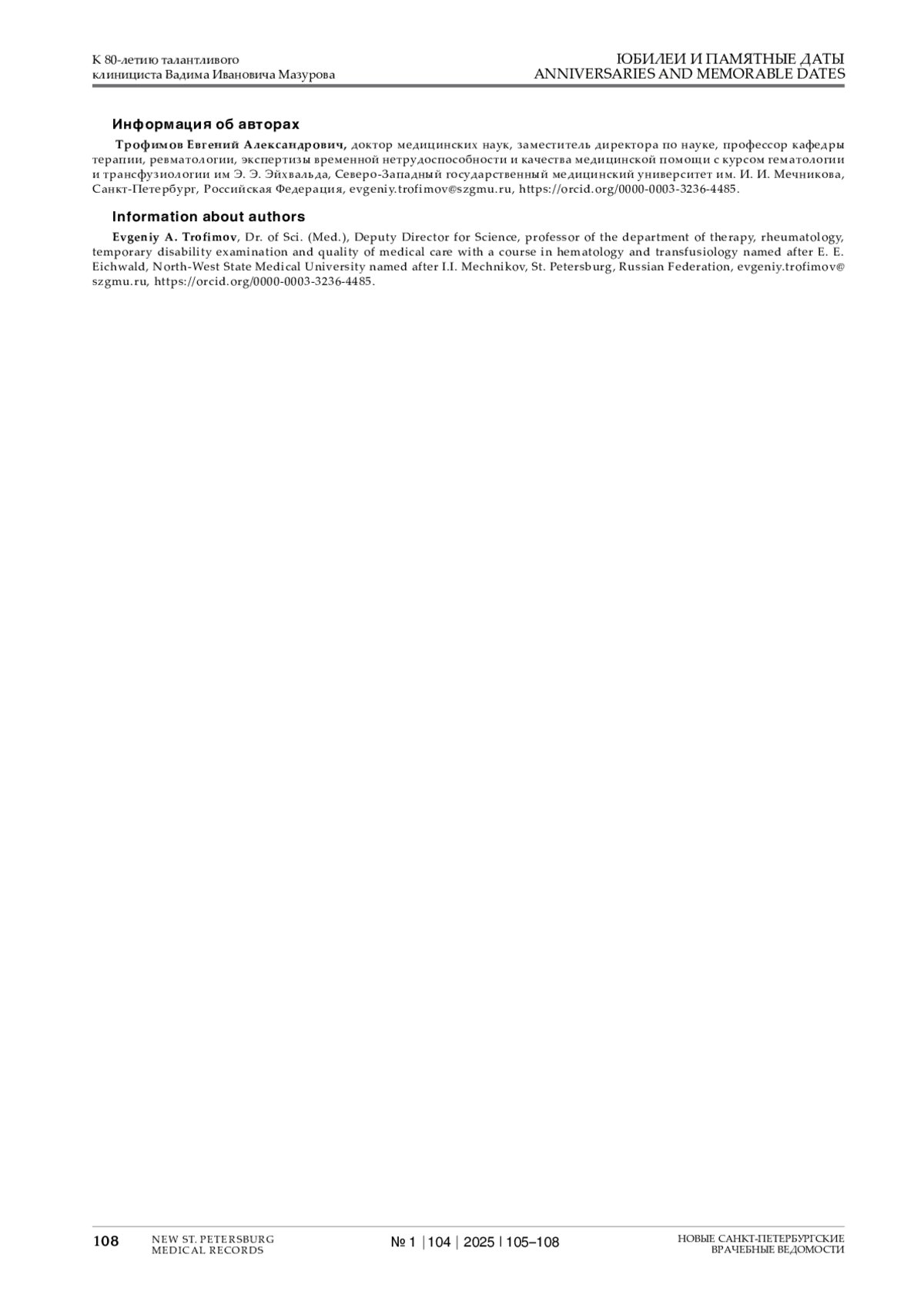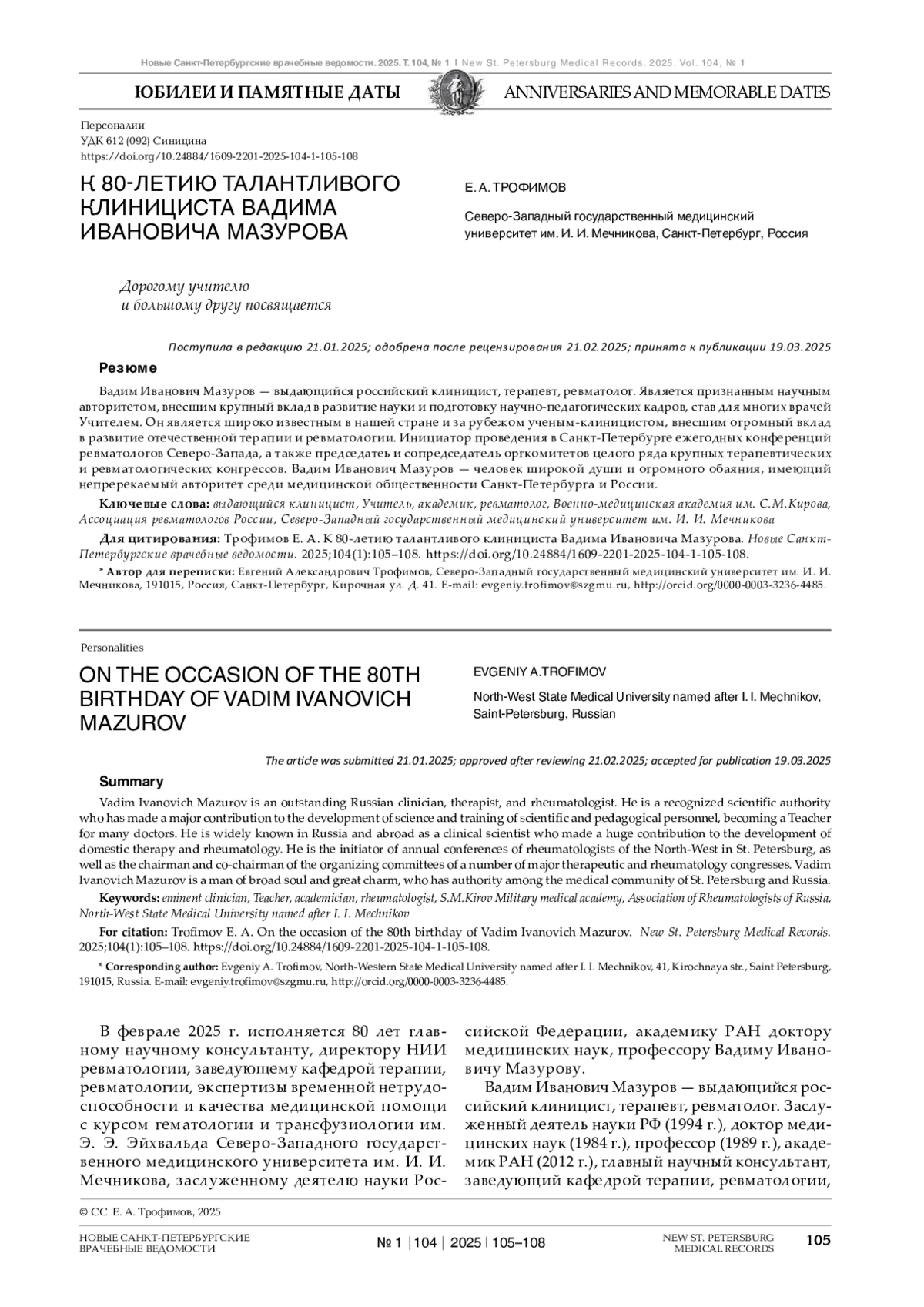 В феврале 2025 г. исполняется 80 лет главному научному консультанту, директору НИИ ревматологии, заведующему кафедрой терапии, ревматологии, экспертизы временной нетрудоспособности и качества медицинской помощи с курсом гематологии и трансфузиологии им. Э. Э. Эйхвальда Северо-Западного государственного медицинского университета им. И. И. Мечникова, заслуженному деятелю науки Российской Федерации, академику РАН доктору медицинских наук, профессору Вадиму Ивановичу Мазурову.
