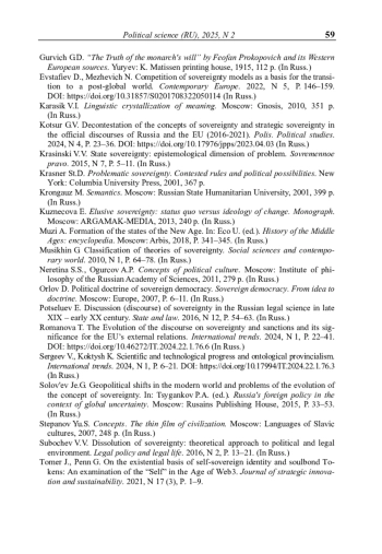 «Суверенитет» как единица языка стремительно начинает заполнять многообразные смысловые ниши, выступая при этом в качественно различающихся семантических статусах. Традиционно терминология суверенитета увязывается с его государственными, народными и национальными версиями, с дихотомией верховенства и независимости, с распространенной таксономией С. Краснера (1) внутренний суверенитет публичной власти во взаимодействии с обществом; 2) международный суверенитет как международно-правовой принцип; 3) «вестфальский» суверенитет как равноправие игроков в международной политике; 4) суверенитет взаимозависимости как способность государства контролировать трансграничные потоки). В нынешнем публично-информационном пространстве номинации, связанные с суверенитетом (шире – свойствами суверенности), проникают в самые разные предметные области. В так называемых «экстралегальных» значениях и словосочетаниях – применительно к политическим, культурным, технологическим, гносеологическим, виртуальным предметам, в виде концептов, или (в отличие от терминов в строгом понимании), образований с открытыми возможностями множественных интерпретаций, с выраженными субъективными началами.