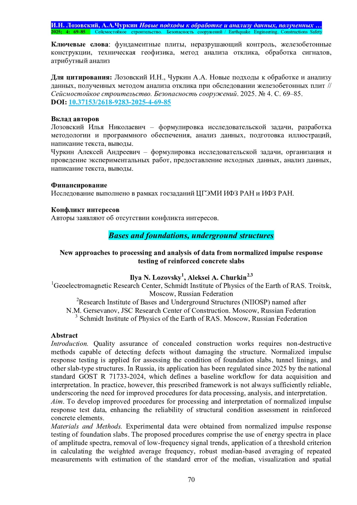 12. Чуркин А.А., Смирнов И.Д. Развитие методики анализа нормированного акустического отклика для оценки контакта конструкция-грунт // Сейсмостойкое строительство. Безопасность сооружений. 2023. № 3. С. 32-47. DOI: 10.37153/2618-9283-2023-3-32-47
