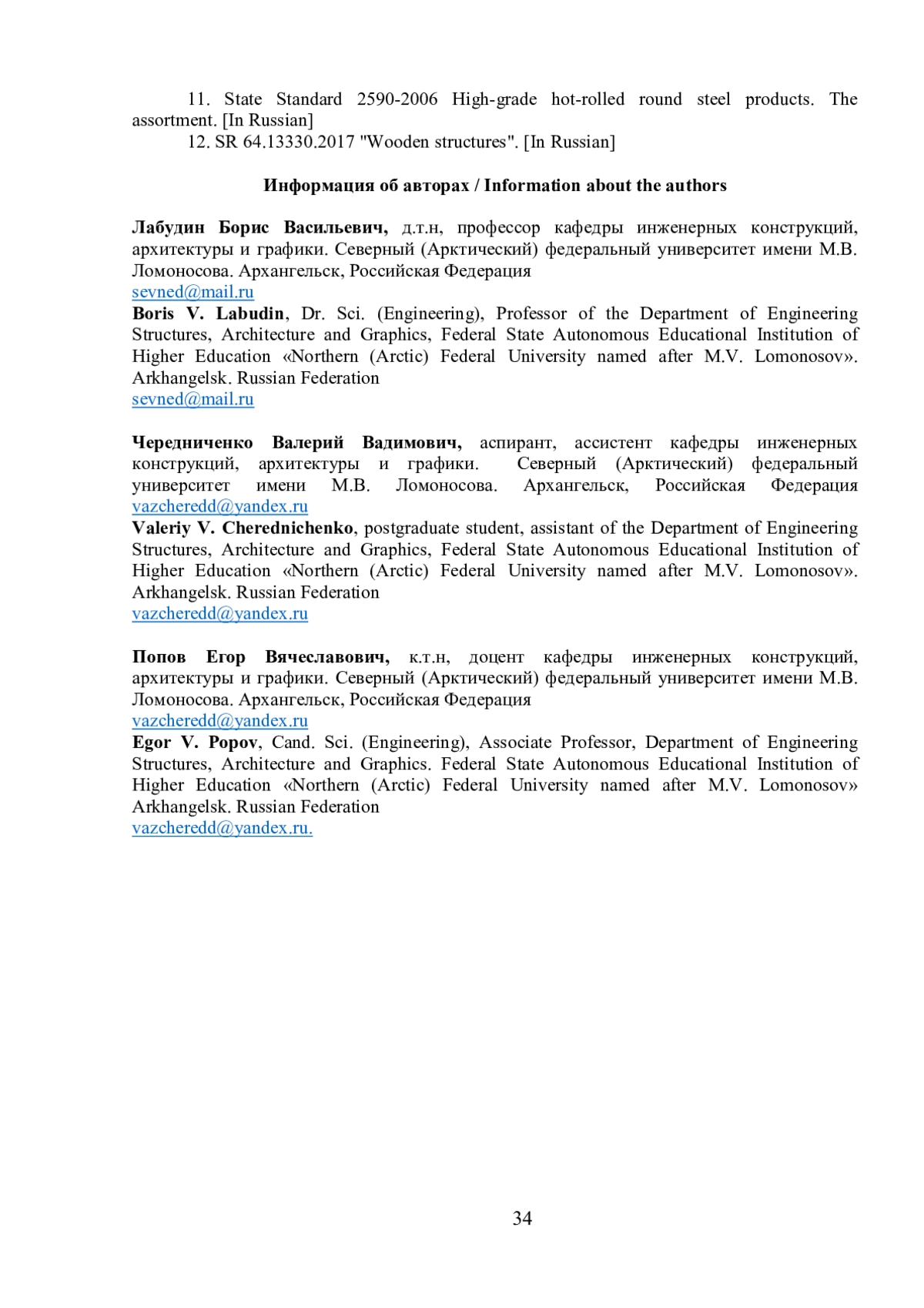 7. Лабудин Б.В., Чередниченко В.В., Карельский А.В., Попов Е.В. Численные исследования конструктивных решений высотных зданий из деревокомпозитных элементов // Известия высших учебных заведений. Строительство. 2024. № 6(786). С. 29-40.