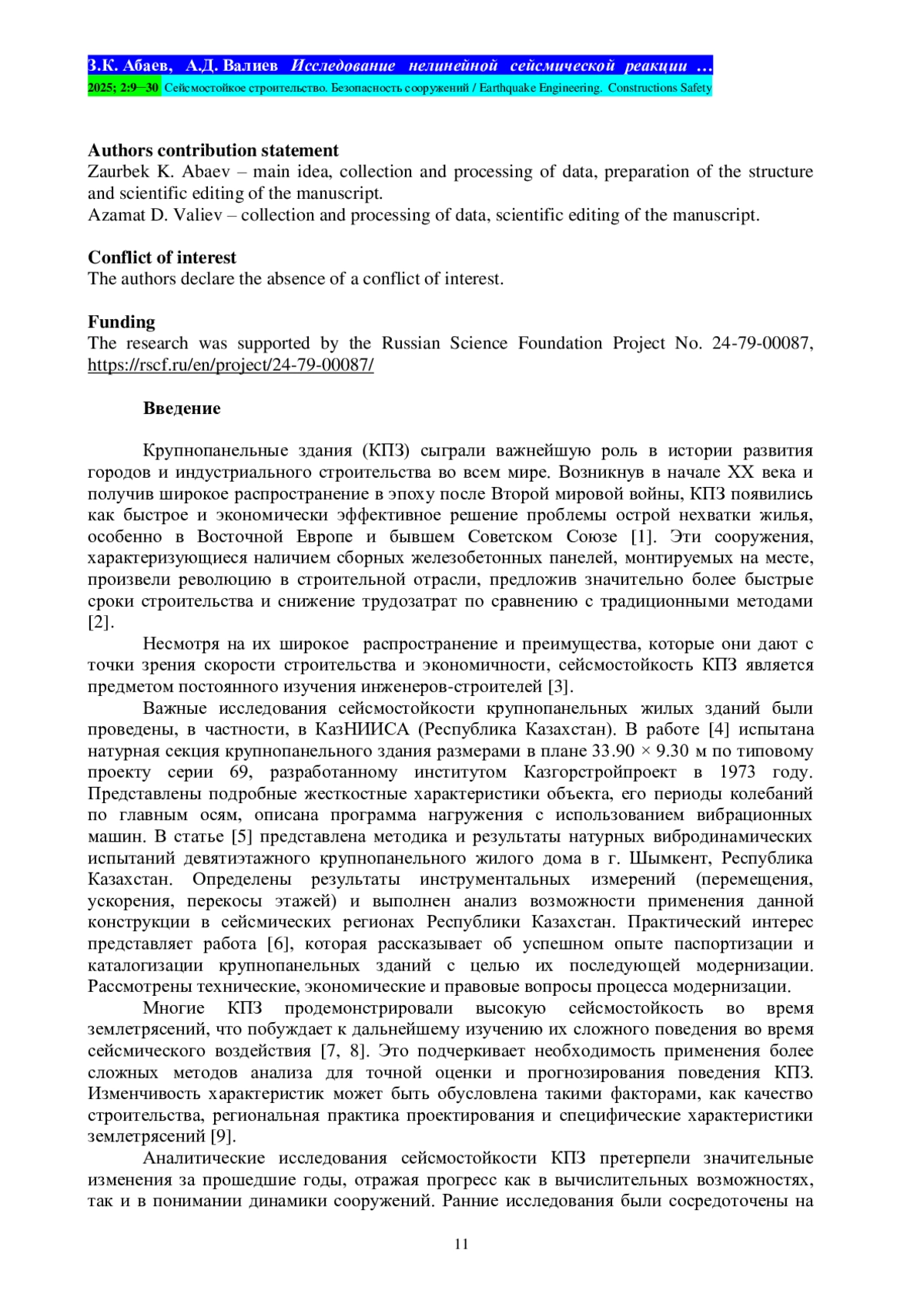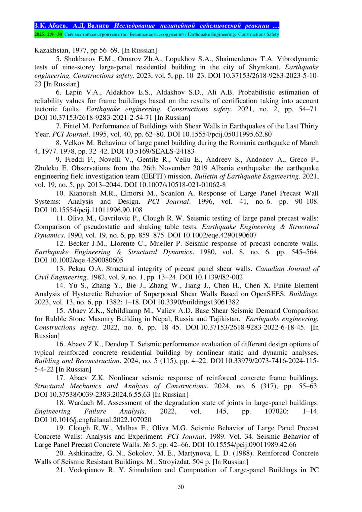 5. Шокбаров Е.М., Омаров Ж.А., Лопухов С. А., Шаймерденов Т.А. Вибродинамические испытания девятиэтажного крупнопанельного жилого дома в городе Шымкент // Сейсмостойкое строительство. Безопасность сооружений. 2023. № 5. C. 10-23. DOI: 10.37153/2618-9283-2023-5-10-23