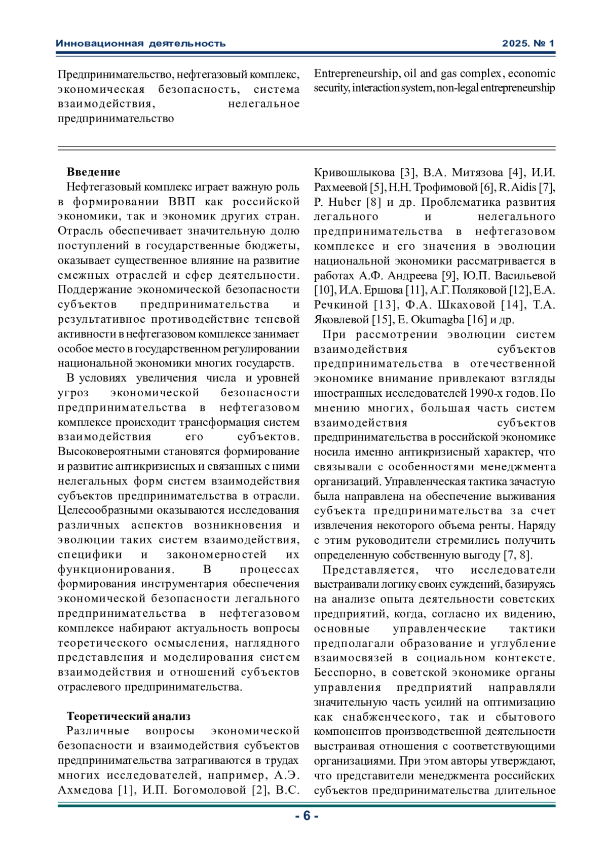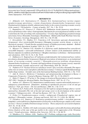 1. Ахмедов А.Э., Смольянинова И.В., Шаталов М.А. Институциональное развитие органов государственного управления в системе обеспечения экономической безопасности страны // Век качества. 2017. № 1. С. 19-34. EDN: YKGFKJ
