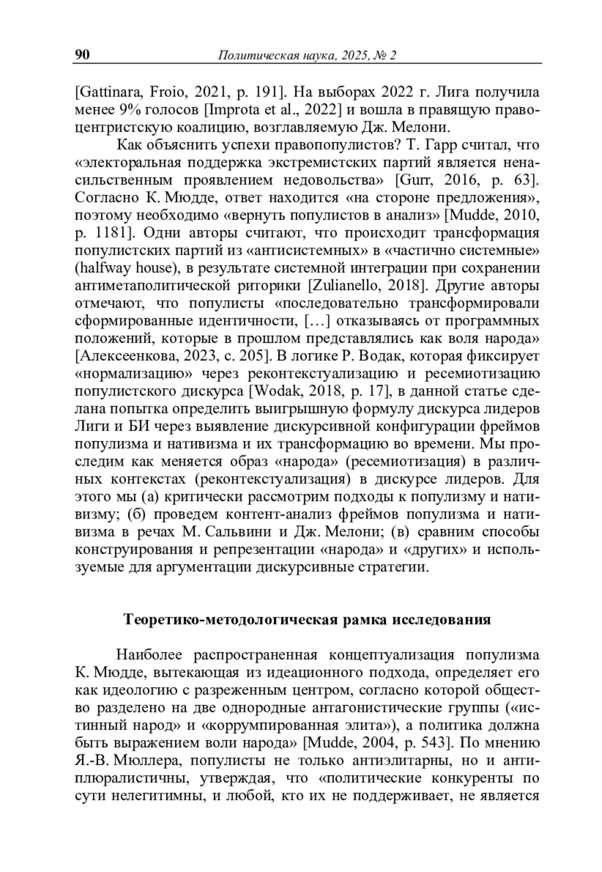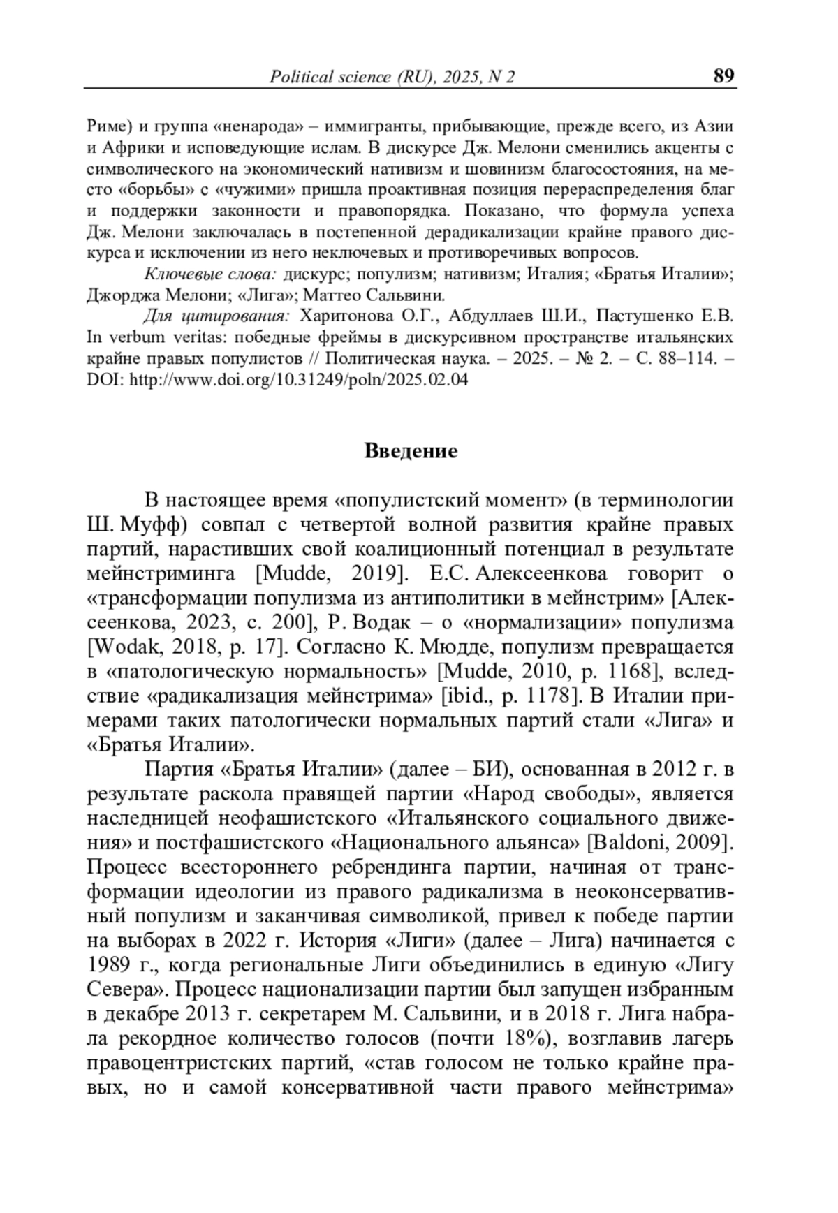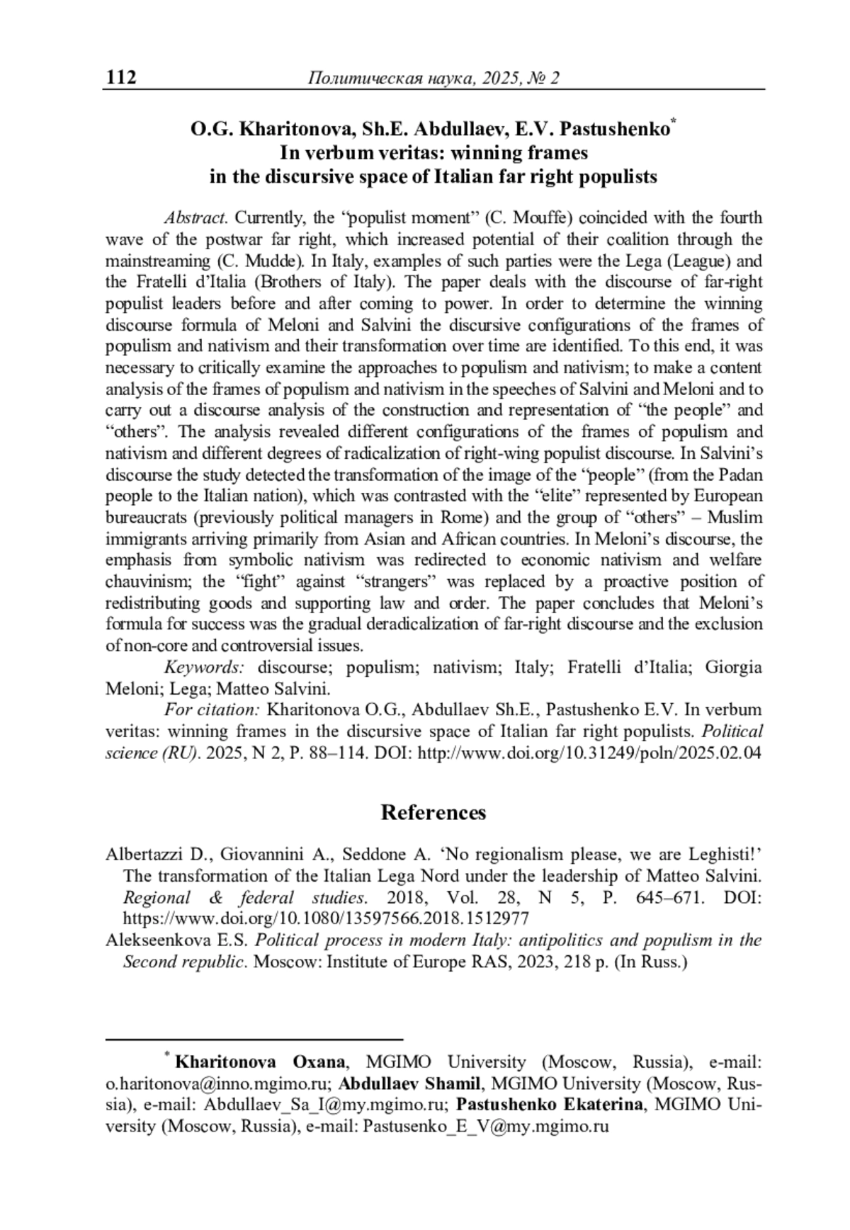 В настоящее время «популистский момент» (Ш. Муфф) совпал с четвертой волной развития крайне правых партий, нарастивших свой коалиционный потенциал в результате мейнстриминга (К. Мюдде). В Италии примерами таких партий стали «Лига» и «Братья Италии». Статья посвящена проблематике дискурса крайне правых популистских лидеров до и после прихода к власти. Сделана попытка определить выигрышную формулу дискурса Дж. Мелони и М. Сальвини через выявление дискурсивной конфигурации фреймов популизма и нативизма и их трансформацию во времени. С этой целью были критически рассмотрены подходы к популизму и нативизму, проведен контент-анализ фреймов популизма и нативизма в речах М. Сальвини и Дж. Мелони и дискурс-анализ конструирования и репрезентации «народа» и «других». Проведенный анализ выявил разные конфигурации фреймов популизма и нативизма и разные степени радикализации правопопулистского дискурса. В дискурсе М. Сальвини произошла трансформация образа «народа» (от паданцев к итальянской нации), которому противопоставлялась «элита» в лице евробюрократов (ранее политические управленцы в Риме) и группа «ненарода» – иммигранты, прибывающие, прежде всего, из Азии и Африки и исповедующие ислам. В дискурсе Дж. Мелони сменились акценты с символического на экономический нативизм и шовинизм благосостояния, на место «борьбы» с «чужими» пришла проактивная позиция перераспределения благ и поддержки законности и правопорядка. Показано, что формула успеха Дж. Мелони заключалась в постепенной дерадикализации крайне правого дискурса и исключении из него неключевых и противоречивых вопросов.
