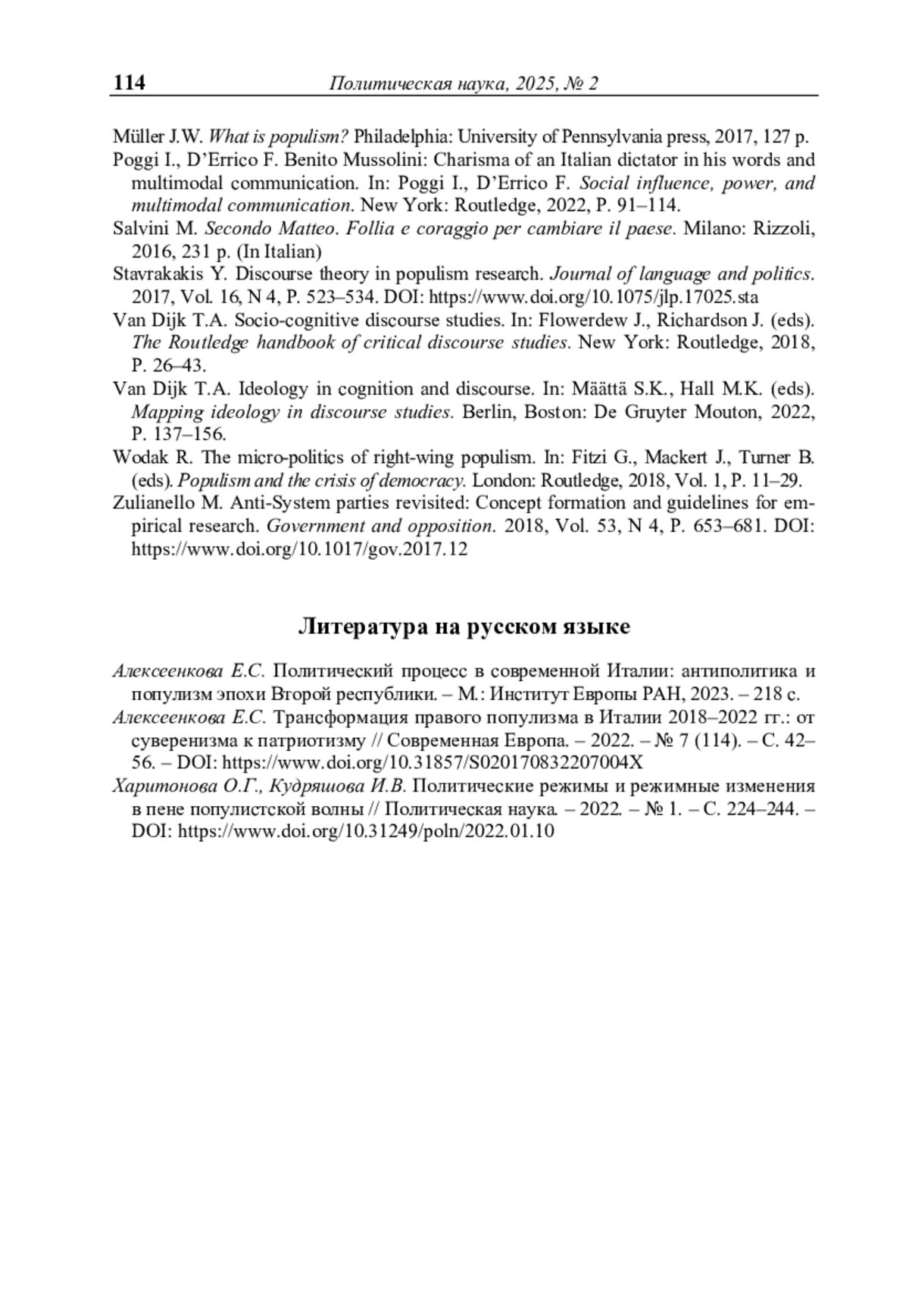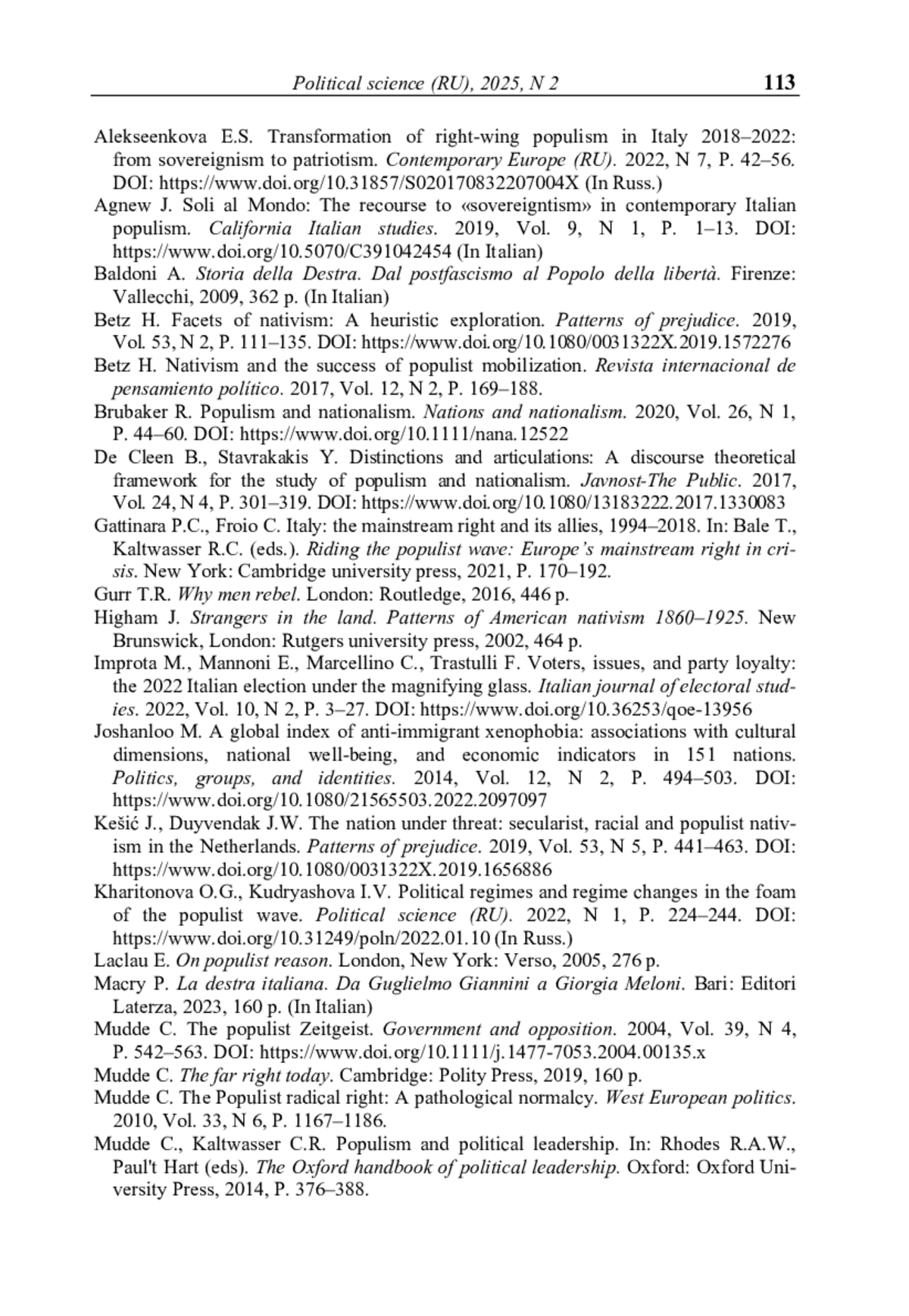 2. Алексеенкова Е.С. Трансформация правого популизма в Италии 2018-2022 гг.: от суверенизма к патриотизму // Современная Европа. - 2022. - № 7 (114). - С. 42-56. - https://doi.org/https://www.doi.org/10.31857/S020170832207004X